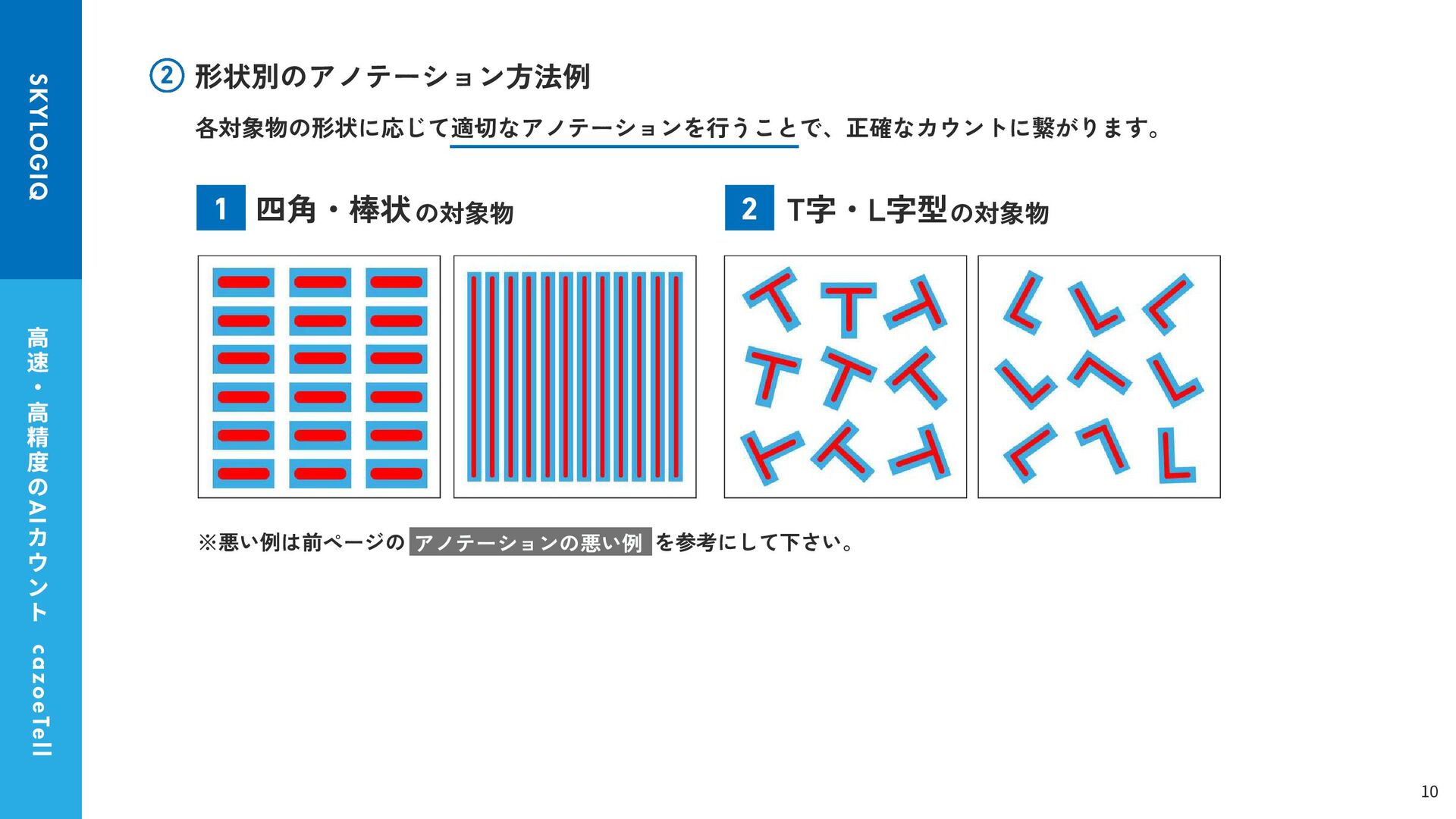 ウ ン ト SKYLOGIQ cazoeTell 2 形状別のアノテーション方法例 各対象物の形状に応じて適切なアノテーションを行うことで、正確なカウントに繋がります。 2 ※悪い例は前ページの を参考にして下さい。 アノテーションの悪い例 四角・棒状 1 T字・L字型 の対象物 の対象物 10