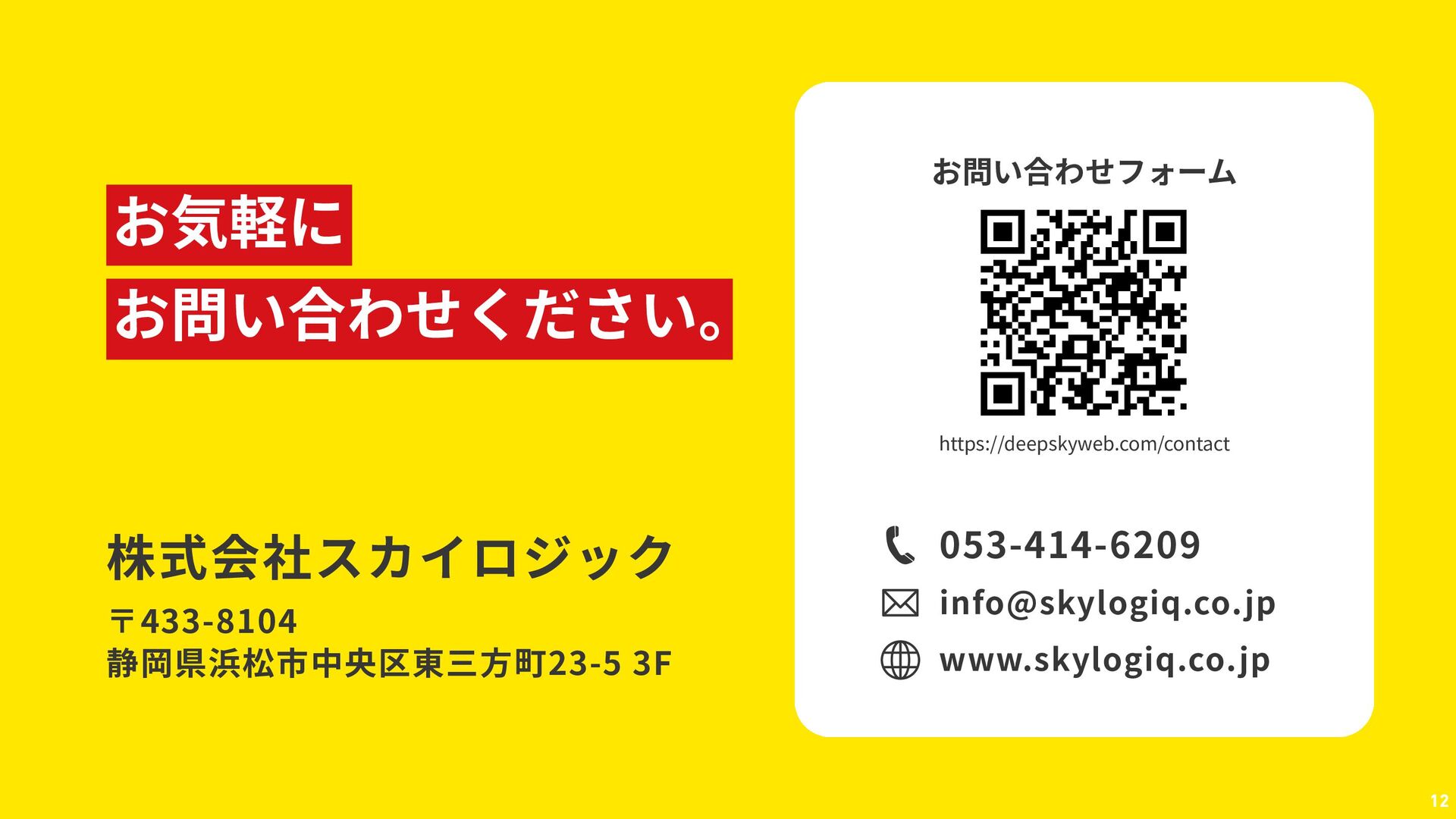 053-414-6209 https://deepskyweb.com/contact お問い合わせフォーム 株式会社スカイロジック 〒433-8104 静岡県浜松市中央区東三方町23-5 3F