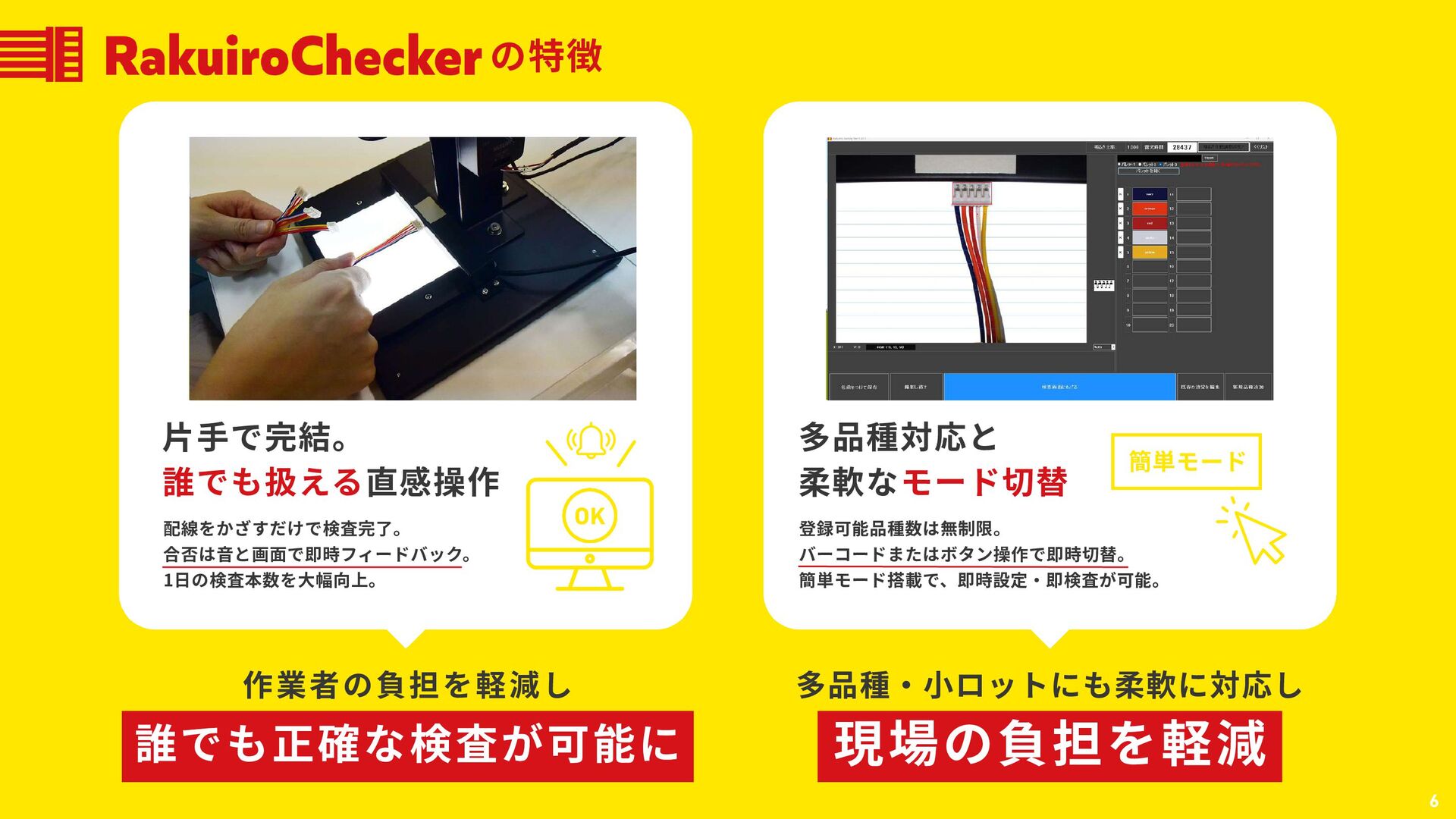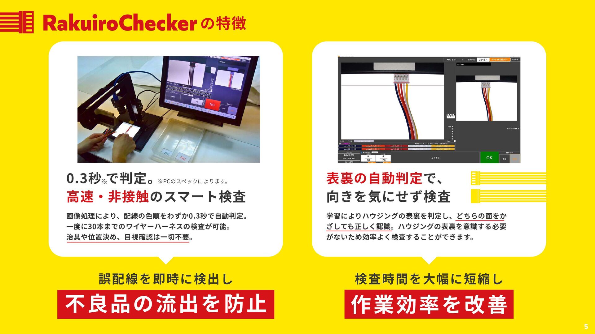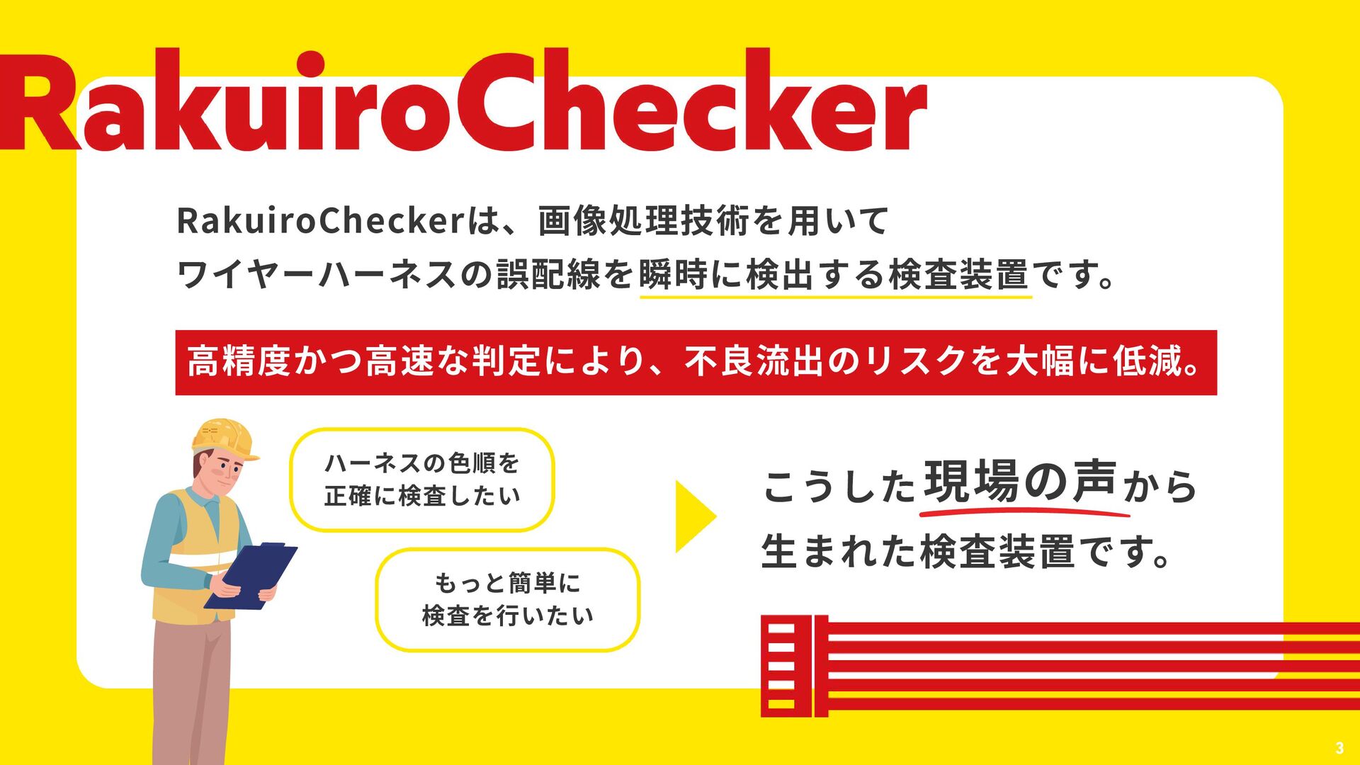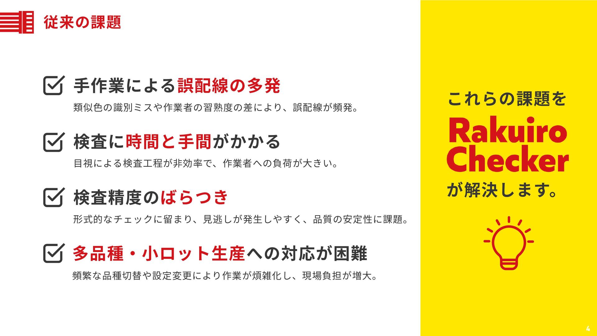 こうした 生まれた検査装置です。 から 現場の声 3 RakuiroCheckerは、画像処理技術を用いて ワイヤーハーネスの誤配線を瞬時に検出する検査装置です。 高精度かつ高速な判定により、不良流出のリスクを大幅に低減。 ハーネスの色順を 正確に検査したい