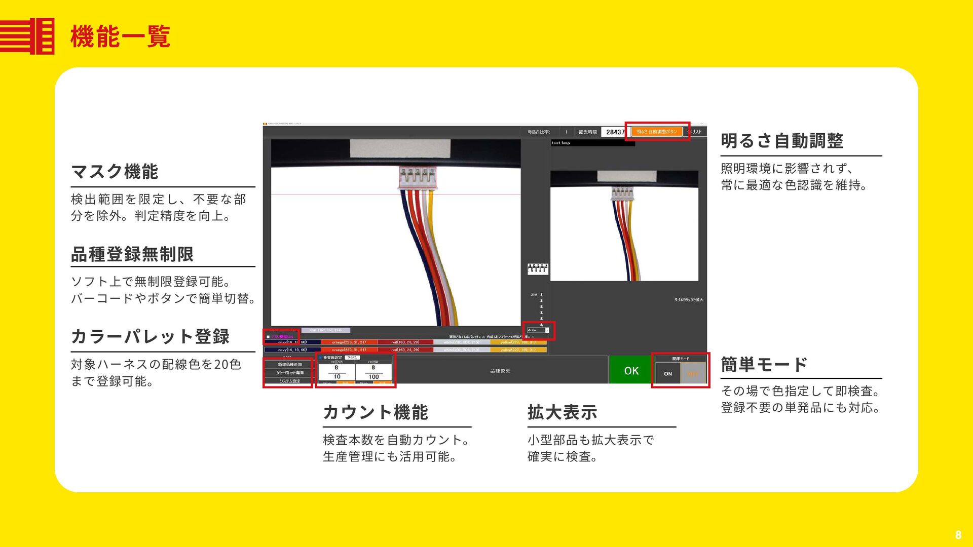 8 カラーパレット登録 対象ハーネスの配線色を20色 まで登録可能。 品種登録無制限 ソフト上で無制限登録可能。 バーコードやボタンで簡単切替。 簡単モード その場で色指定して即検査。 登録不要の単発品にも対応。
