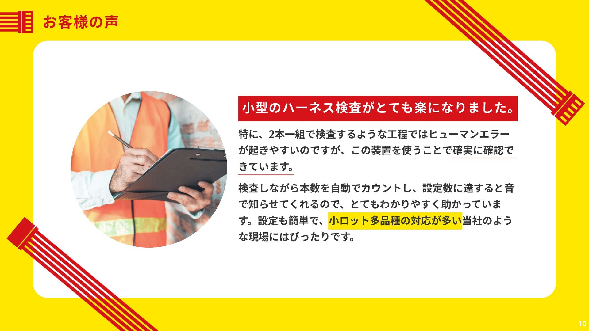 特に、2本一組で検査するような工程ではヒューマンエラー が起きやすいのですが、この装置を使うことで確実に確認で きています。 10 小型のハーネス検査がとても楽になりました。 お客様の声 検査しながら本数を自動でカウントし、設定数に達すると音 で知らせてくれるので、とてもわかりやすく助かっていま す。設定も簡単で、小ロット多品種の対応が多い当社のよう な現場にはぴったりです。