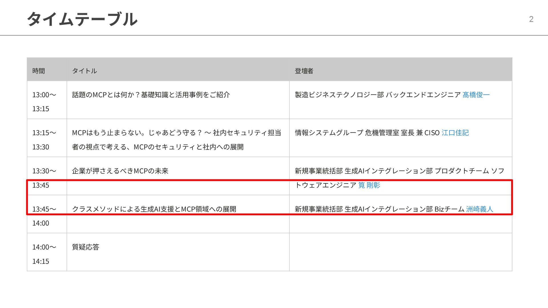 1. タイムテーブル 2 時間 タイトル 登壇者 13:00〜 13:15 話題のMCPとは何か?基礎知識と活用事例をご紹介 製造ビジネステクノロジー部 バックエンドエンジニア