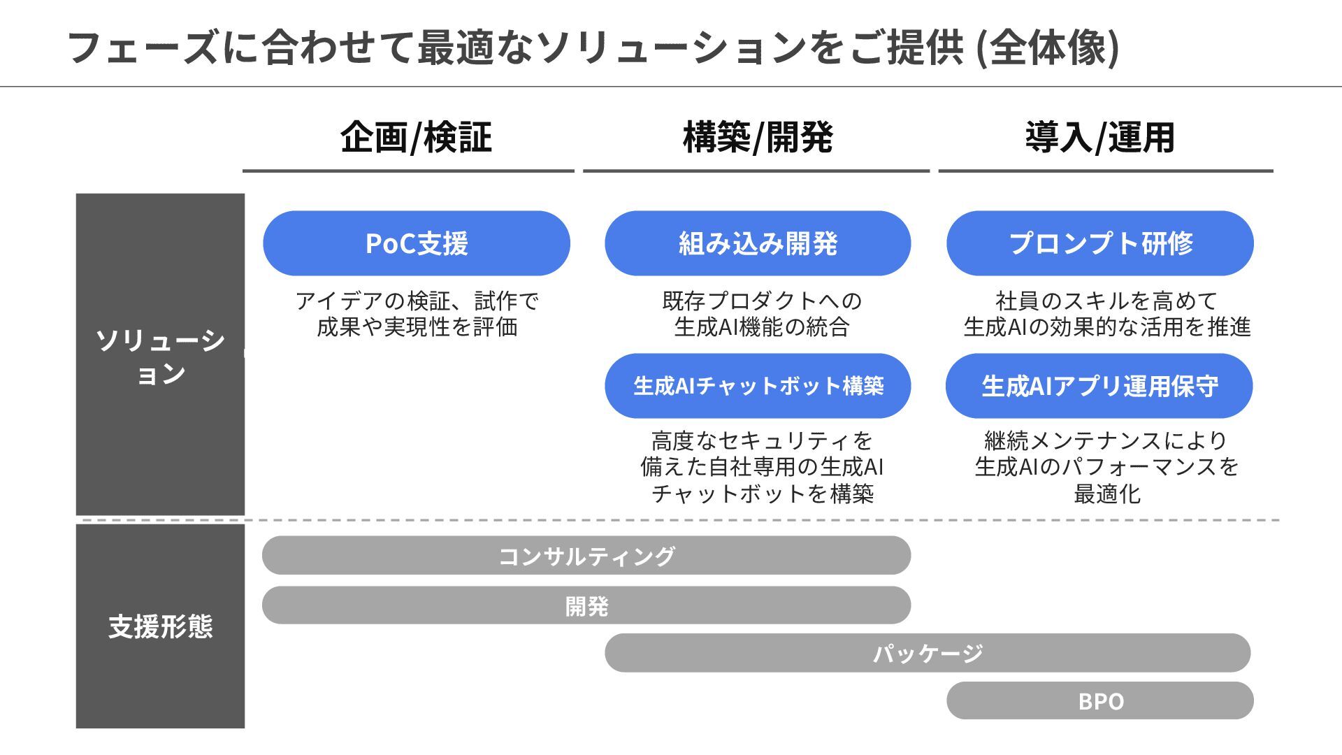 高度なセキュリティを 備えた自社専用の生成AI チャットボットを構築 継続メンテナンスにより 生成AIのパフォーマンスを 最適化 支援形態 企画/検証 構築/開発 導入/運用 PoC支援 組み込み開発 生成AIチャットボット構築 プロンプト研修 生成AIアプリ運用保守 コンサルティング パッケージ BPO 開発