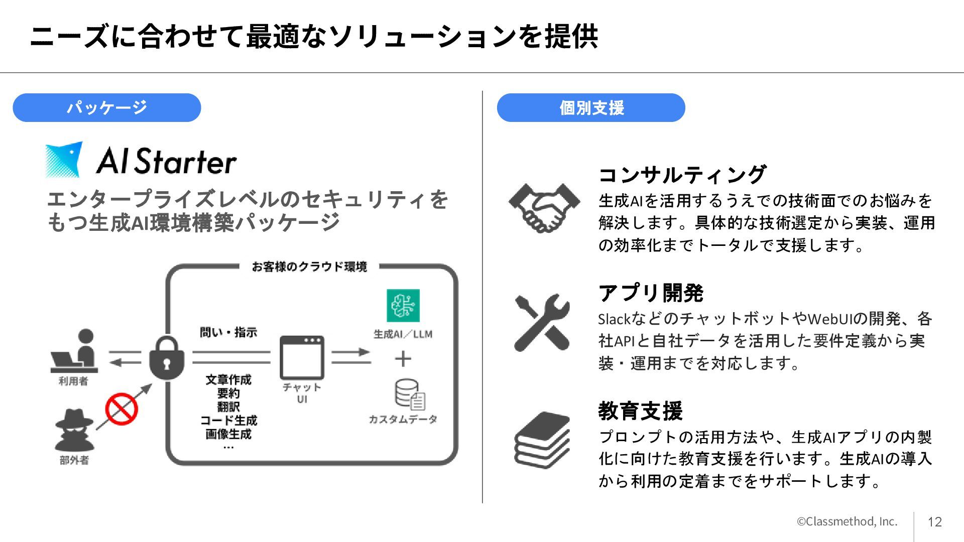7. ©Classmethod, Inc. ニーズに合わせて最適なソリューションを提供 エンタープライズレベルのセキュリティを もつ生成AI環境構築パッケージ パッケージ 個別支援 コンサルティング 生成AIを活用するうえでの技術面でのお悩みを 解決します。具体的な技術選定から実装、運用