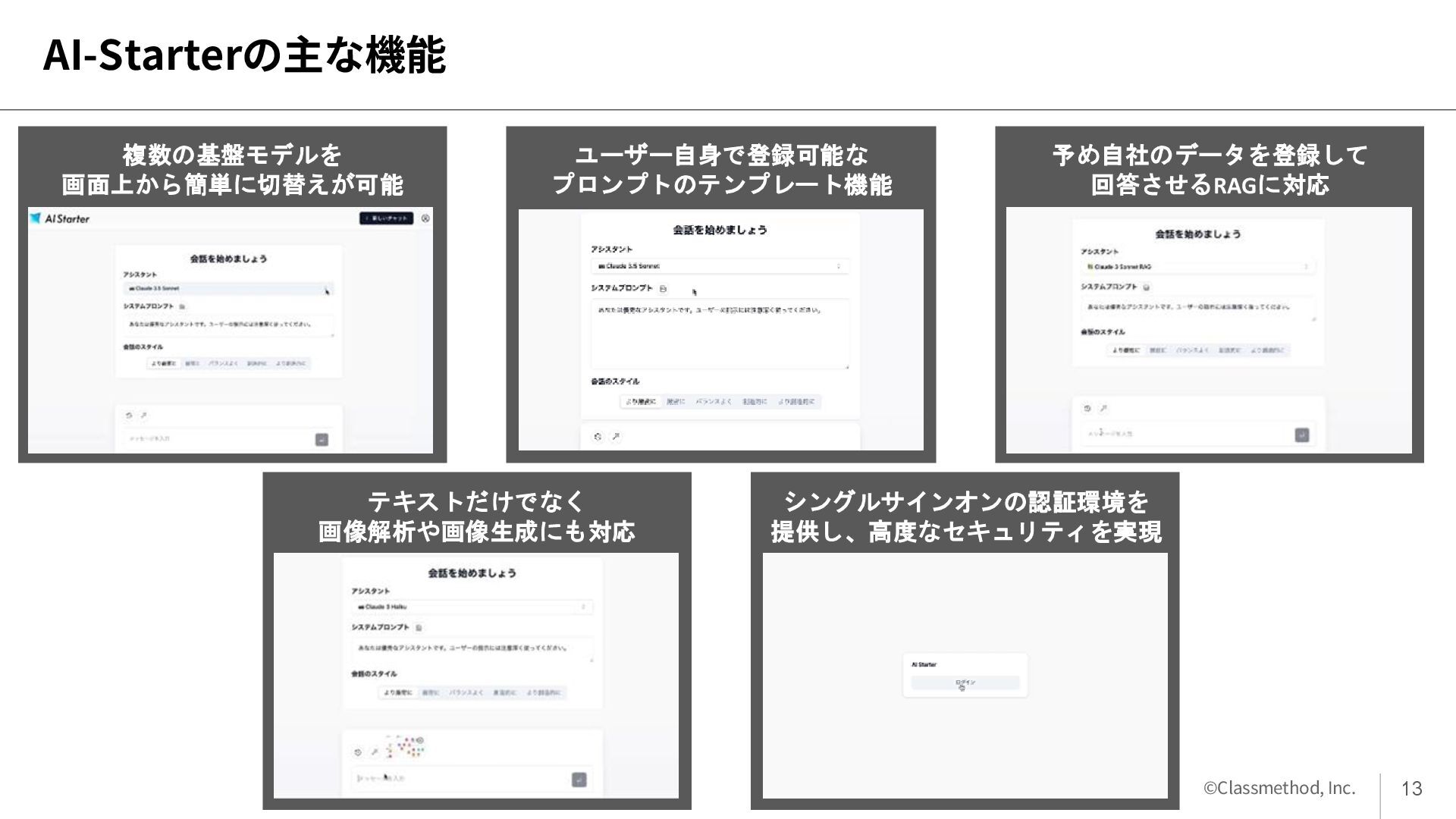の効率化までトータルで支援します。 アプリ開発 SlackなどのチャットボットやWebUIの開発、各 社APIと自社データを活用した要件定義から実 装・運用までを対応します。 教育支援 プロンプトの活用方法や、生成AIアプリの内製 化に向けた教育支援を行います。生成AIの導入 から利用の定着までをサポートします。 12