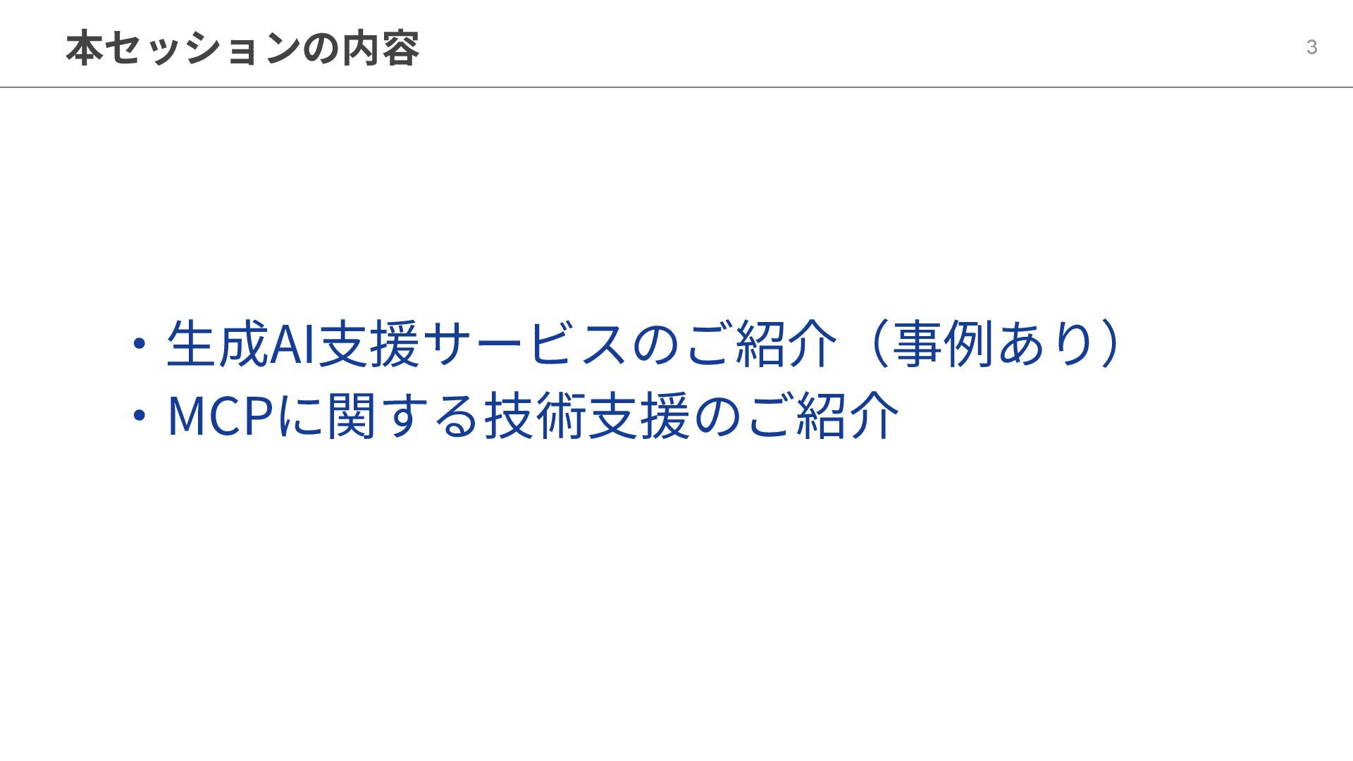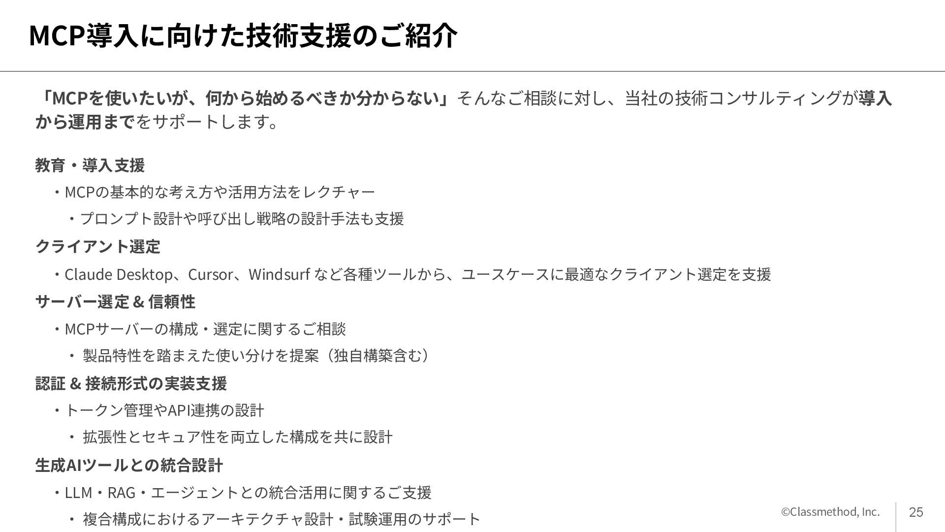 • 成果が不確実 → PoCで「仮説と検証」を小さく繰り返す進め方が重要 • 「導入したのに使われない」 → 利用定着のための工夫(ワークショップ)が必要 MCP領域の支援 • MCPはLLMとツールを標準化された方法で接続する新しい技術基盤 • AIプロダクトの持続性と拡張性が高められることが期待される