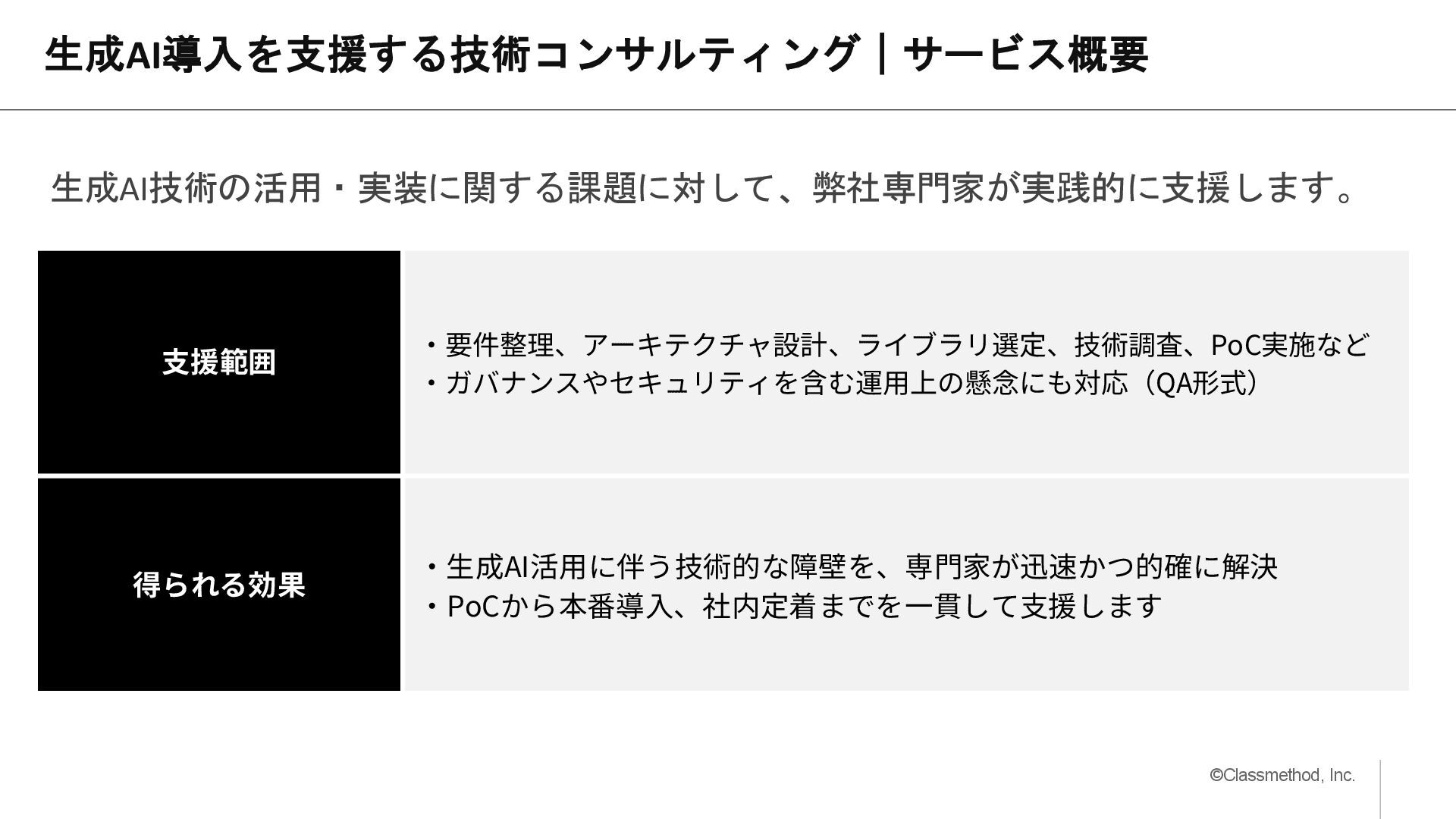 技術検証の ノウハウ不足 複数の生成AIモデルや環境を実際に試して 特徴を掴みたい Azure含め複数の生成AI環境/モデルに対する 技術コンサル 生成AI専門家の 不在 実践教育の場(GPT-Lab)を推進するにあたり 壁打ち相手が必要 生成AI活用の企画立案、 各チームの壁打ち役など伴奏支援 運用のスキルや リソースの不足 情シス管轄になったが、環境保守や 社内問い合わせに対応できる人がいない Azure環境の運用保守 ユーザー部門からの問い合わせ窓口代行 課題 解決案 〉 〉 〉 〉 「KOKUYO DIGITAL ACADEMY」生成AI環境 の構築支援 デジタル人材教育・実践プログラムとカルチャ ーを技術で下支え https://classmethod.jp/cases/kokuyo/ https://classmethod.jp/cases/kokuyo/ 効果: 非エンジニアの社員自身たちで複数のアプリを開発