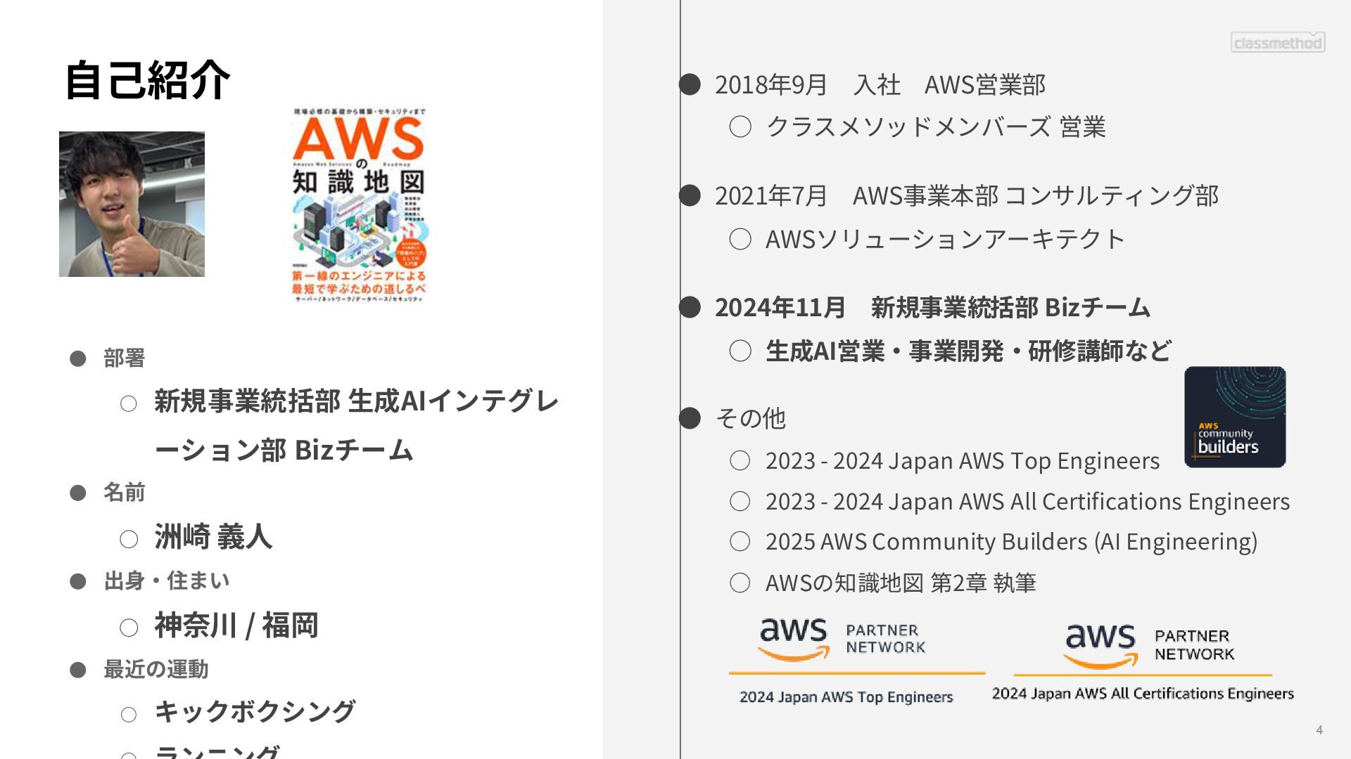 2021年7月 AWS事業本部 コンサルティング部 ◦ AWSソリューションアーキテクト • 2024年11月 新規事業統括部 Bizチーム ◦ 生成AI営業・事業開発・研修講師など • その他 ◦ 2023 - 2024 Japan AWS Top Engineers ◦ 2023 - 2024 Japan AWS All Certifications Engineers ◦ 2025 AWS Community Builders (AI Engineering) ◦ AWSの知識地図 第2章 執筆 • 部署 ◦ 新規事業統括部 生成AIインテグレ ーション部 Bizチーム • 名前 ◦ 洲崎 義人 • 出身・住まい ◦ 神奈川 / 福岡 • 最近の運動 ◦ キックボクシング