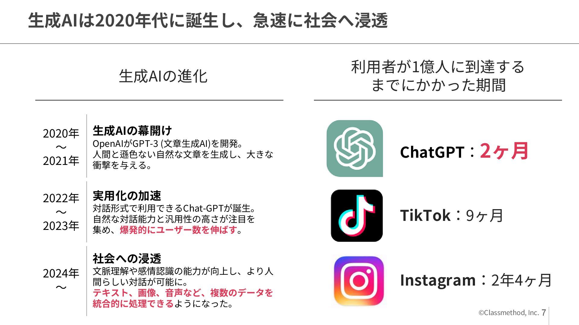 3. ©Classmethod, Inc. 生成AIは2020年代に誕生し、急速に社会へ浸透 利用者が1億人に到達する までにかかった期間 ChatGPT:2ヶ月 TikTok:9ヶ月 Instagram:2年4ヶ月 生成AIの進化 2020年