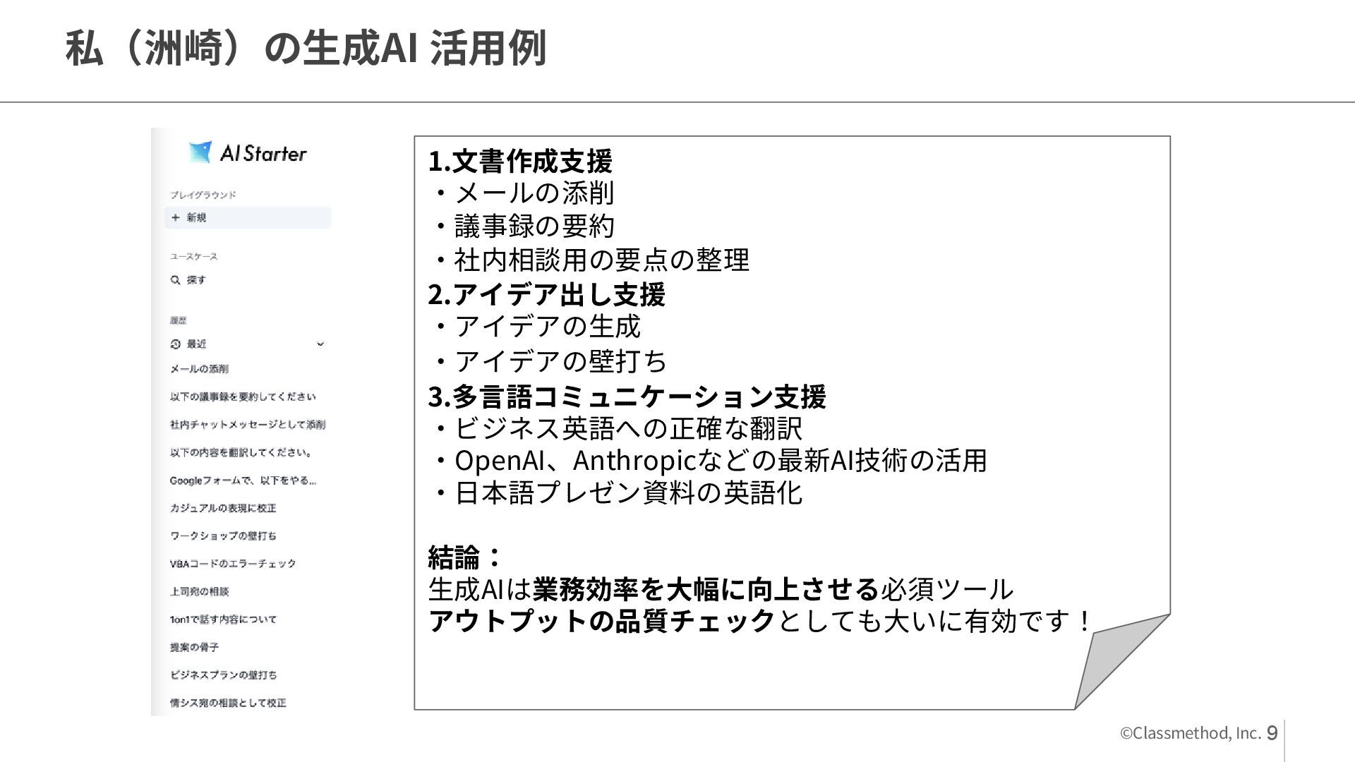 ・アイデアの壁打ち 3.多言語コミュニケーション支援 ・ビジネス英語への正確な翻訳 ・OpenAI、Anthropicなどの最新AI技術の活用 ・日本語プレゼン資料の英語化 結論: 生成AIは業務効率を大幅に向上させる必須ツール アウトプットの品質チェックとしても大いに有効です! 9