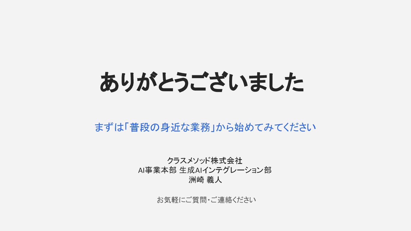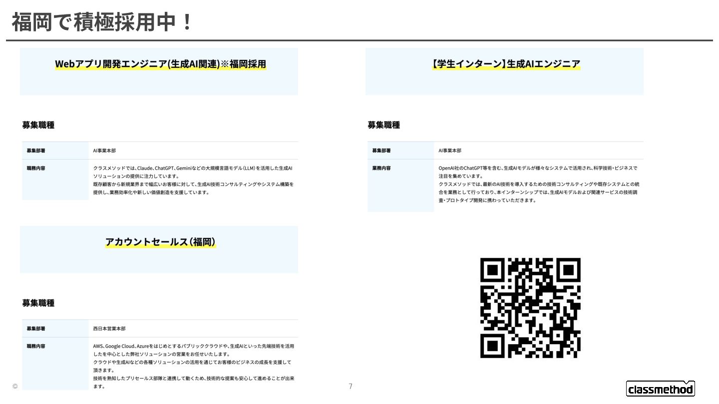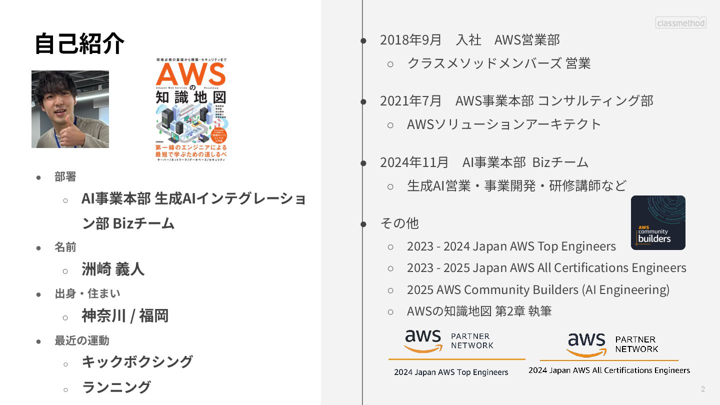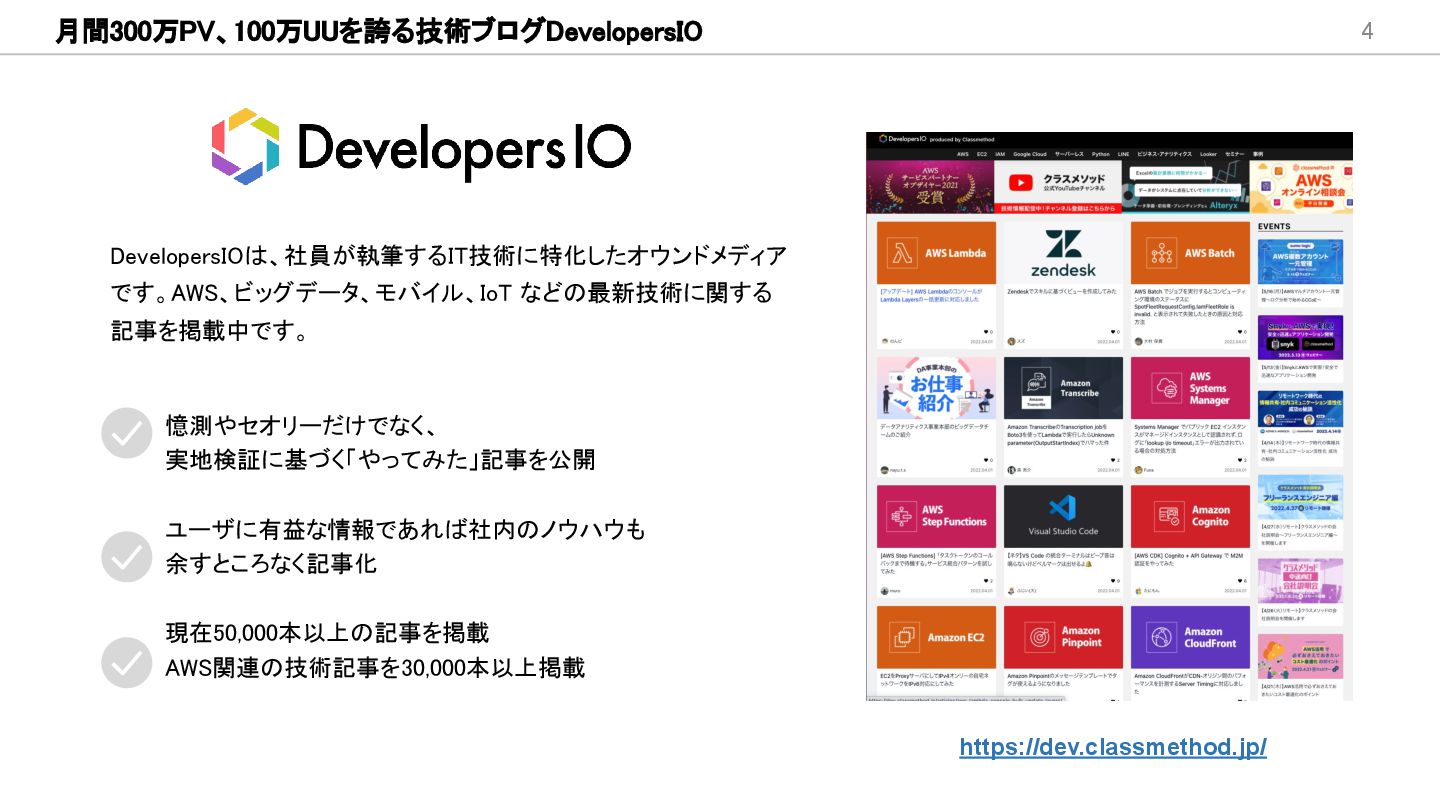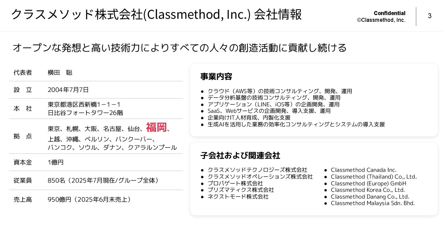 設 立 2004年7月7日 本 社 東京都港区西新橋1-1-1 日比谷フォートタワー26階 拠 点 東京、札幌、大阪、名古屋、仙台、 福岡、 上越、沖縄、ベルリン、バンクーバー、 バンコク、ソウル、ダナン、クアラルンプール 資本金 1億円 従業員 850名(2025年7月現在/グループ全体) 売上高 950億円(2025年6月末売上) 事業内容 • クラウド(AWS等)の技術コンサルティング、開発、運用 • データ分析基盤の技術コンサルティング、開発、運用 • アプリケーション(LINE、iOS等)の企画開発、運用 • SaaS、Webサービスの企画開発、導入支援、運用 • 企業向けIT人材育成、内製化支援 • 生成AIを活用した業務の効率化コンサルティングとシステムの導入支援 子会社および関連会社 • クラスメソッドテクノロジーズ株式会社 • クラスメソッドオペレーションズ株式会社 • プロパゲート株式会社 • プリズマティクス株式会社 • ネクストモード株式会社 • Classmethod Canada Inc. • Classmethod (Thailand) Co., Ltd. • Classmethod (Europe) GmbH • Classmethod Korea Co., Ltd. • Classmethod Danang Co., Ltd. • Classmethod Malaysia Sdn. Bhd.
