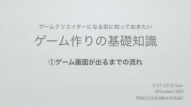 ήʔϜ࡞Γͷجૅࣝ 4VO !4V[FFQ IUUQMTETBLVSBOFKQ ήʔϜΫϦΤΠλʔʹͳΔલʹ͓͖͍ͬͯͨ ᶃήʔϜը໘͕ग़Δ·ͰͷྲྀΕ