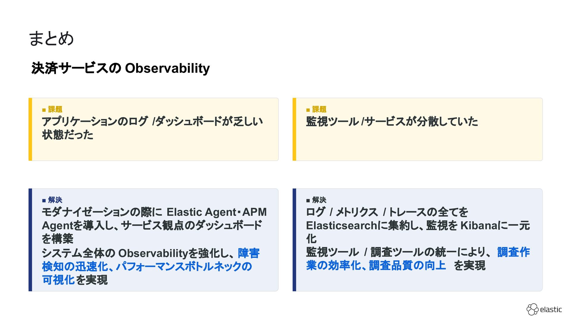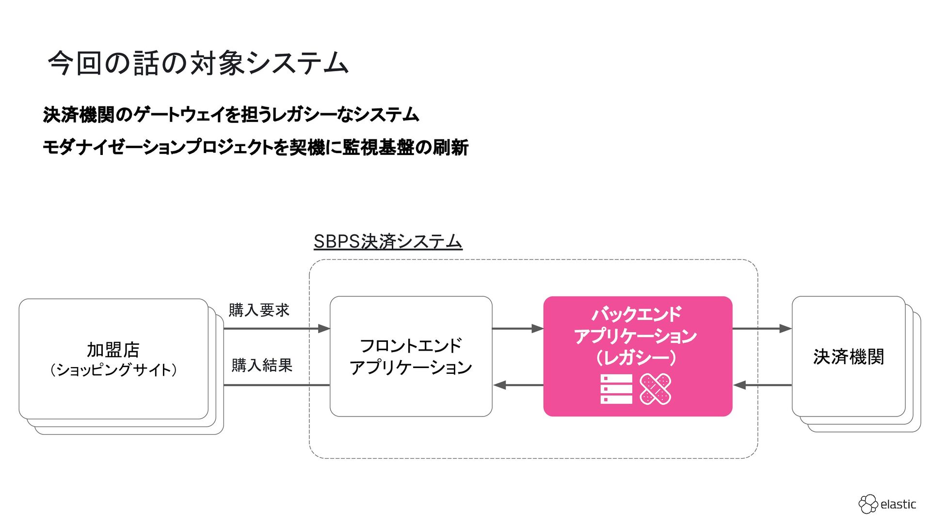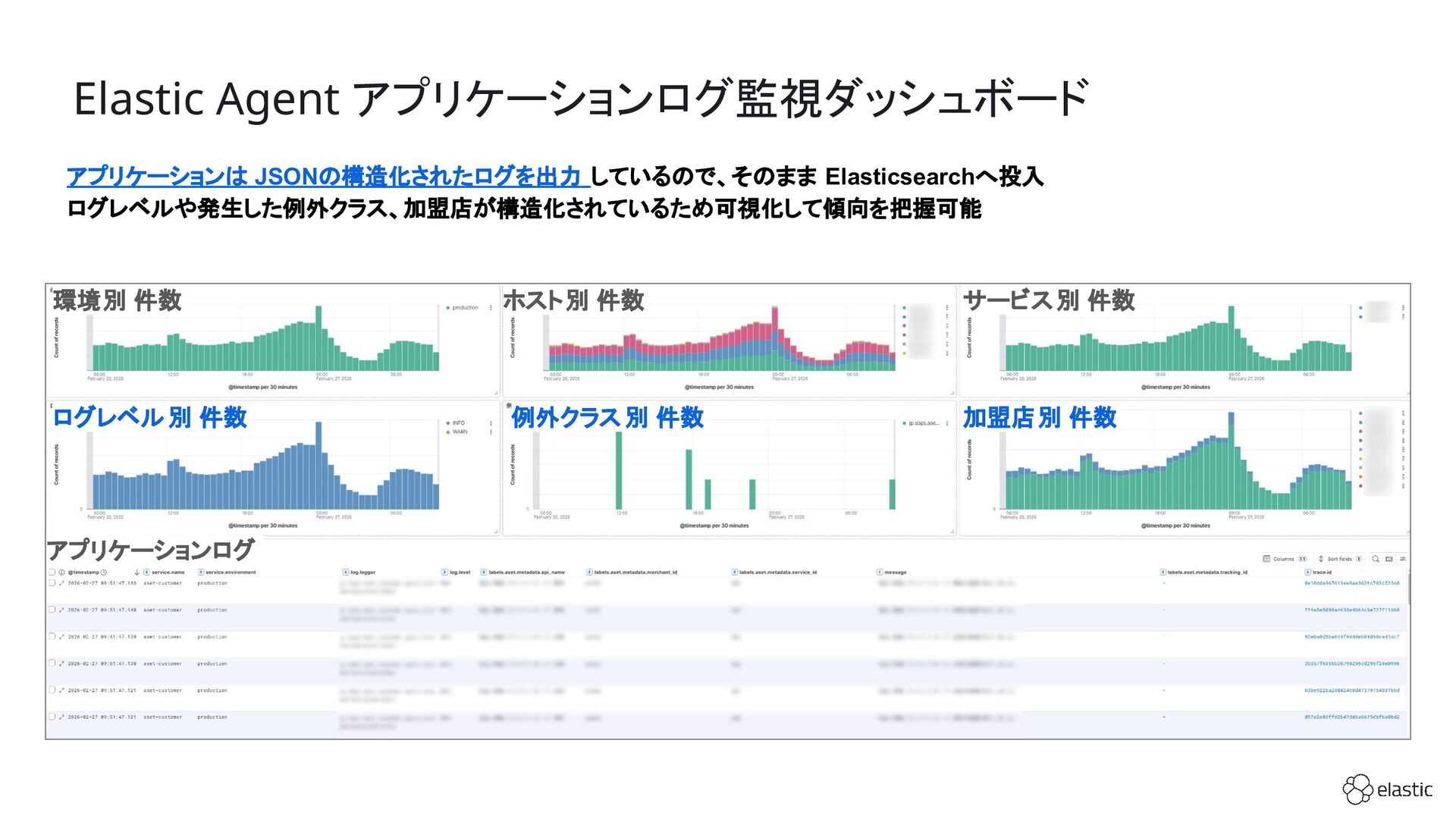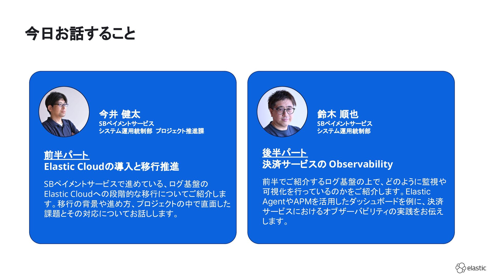 SBペイメントサービスでは、増大するログ量や運用負荷といった課題を背景に、決済サービスを支えるログ基盤をElastic Cloudへ段階的に移行しています。本セッション前半では、移行に至った背景や進め方、移行プロジェクトで直面した課題とそれに対する工夫についてご紹介します。後半では、実際に決済サービスの監視で活用しているダッシュボードを例に、Elastic AgentやAPMを用いたオブザーバビリティの実践的な取り組みをお伝えします。