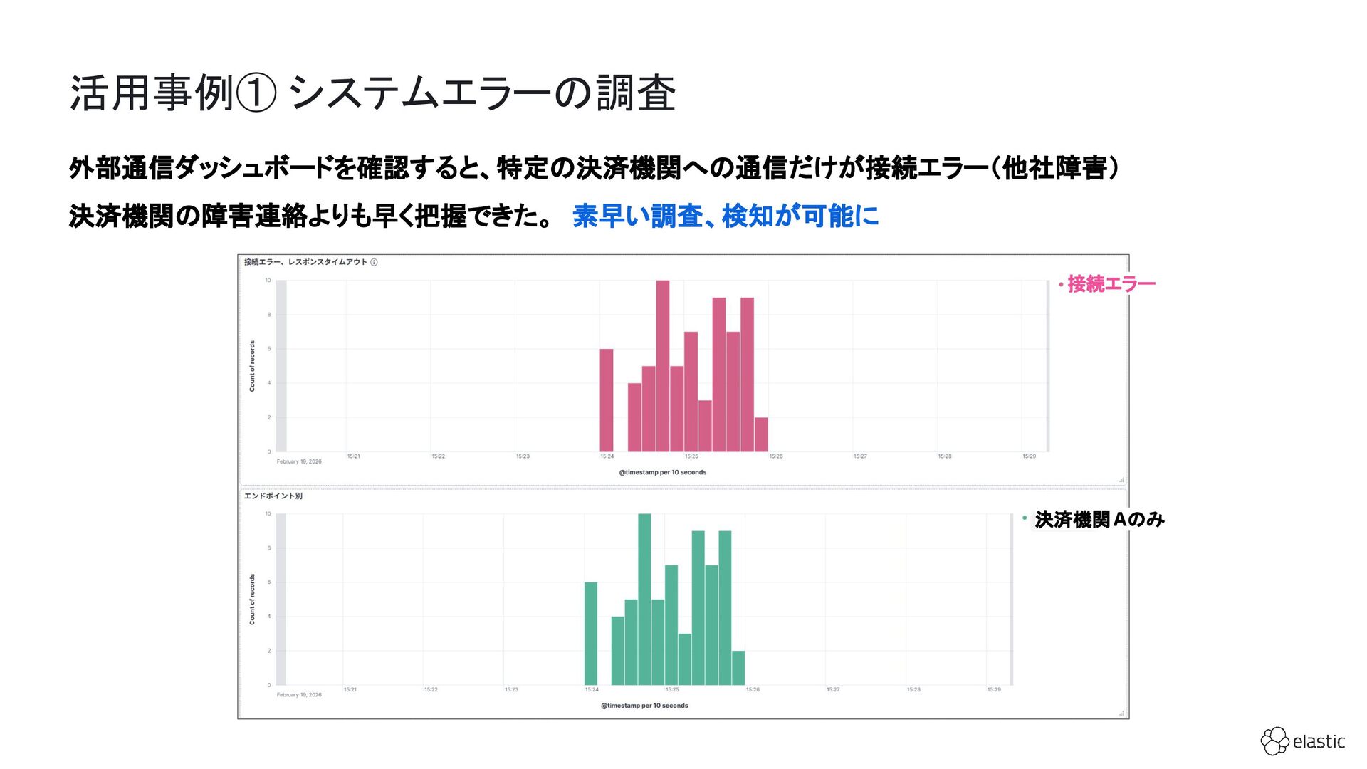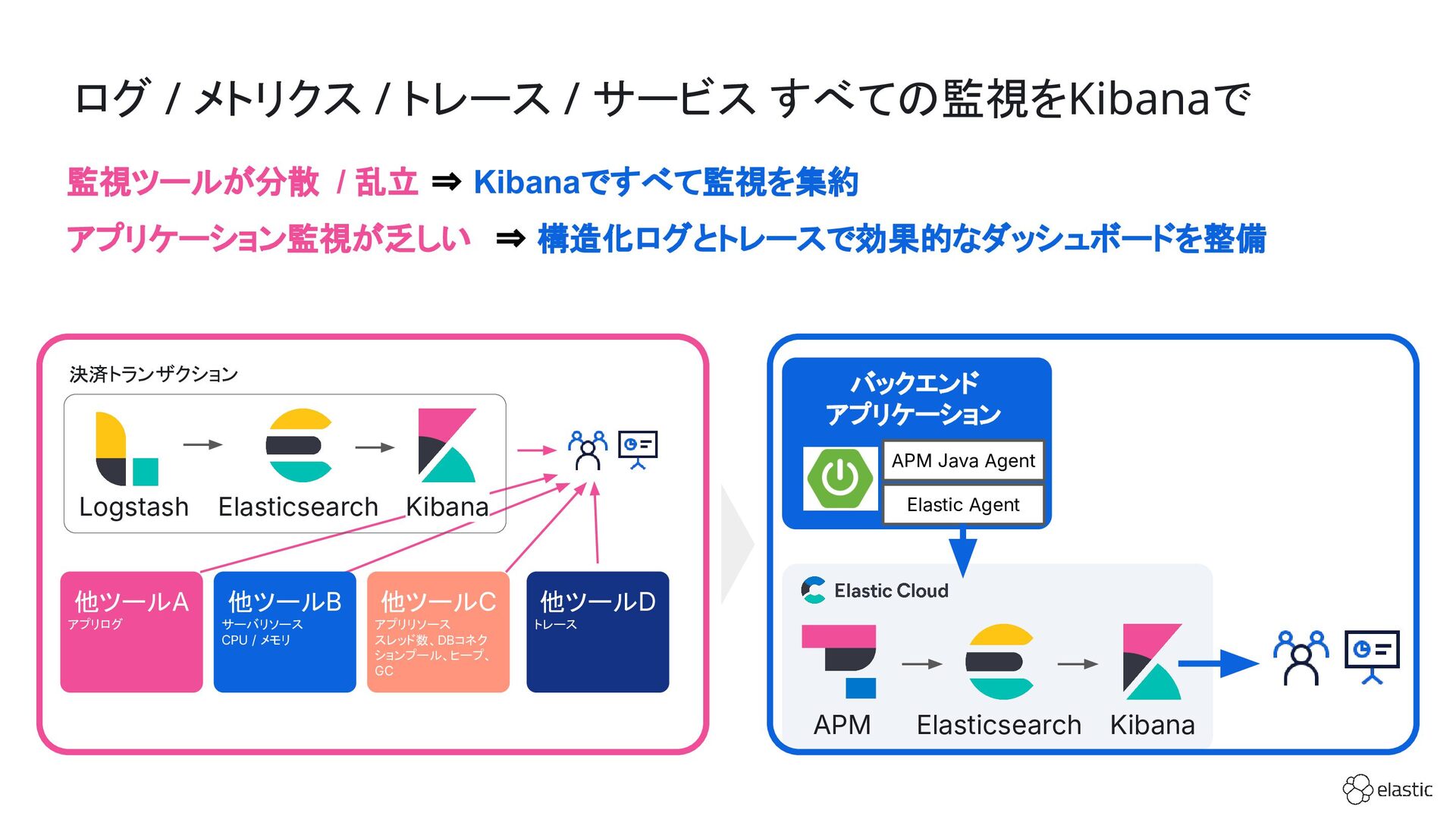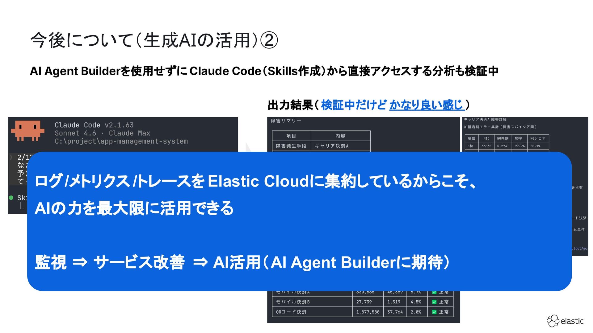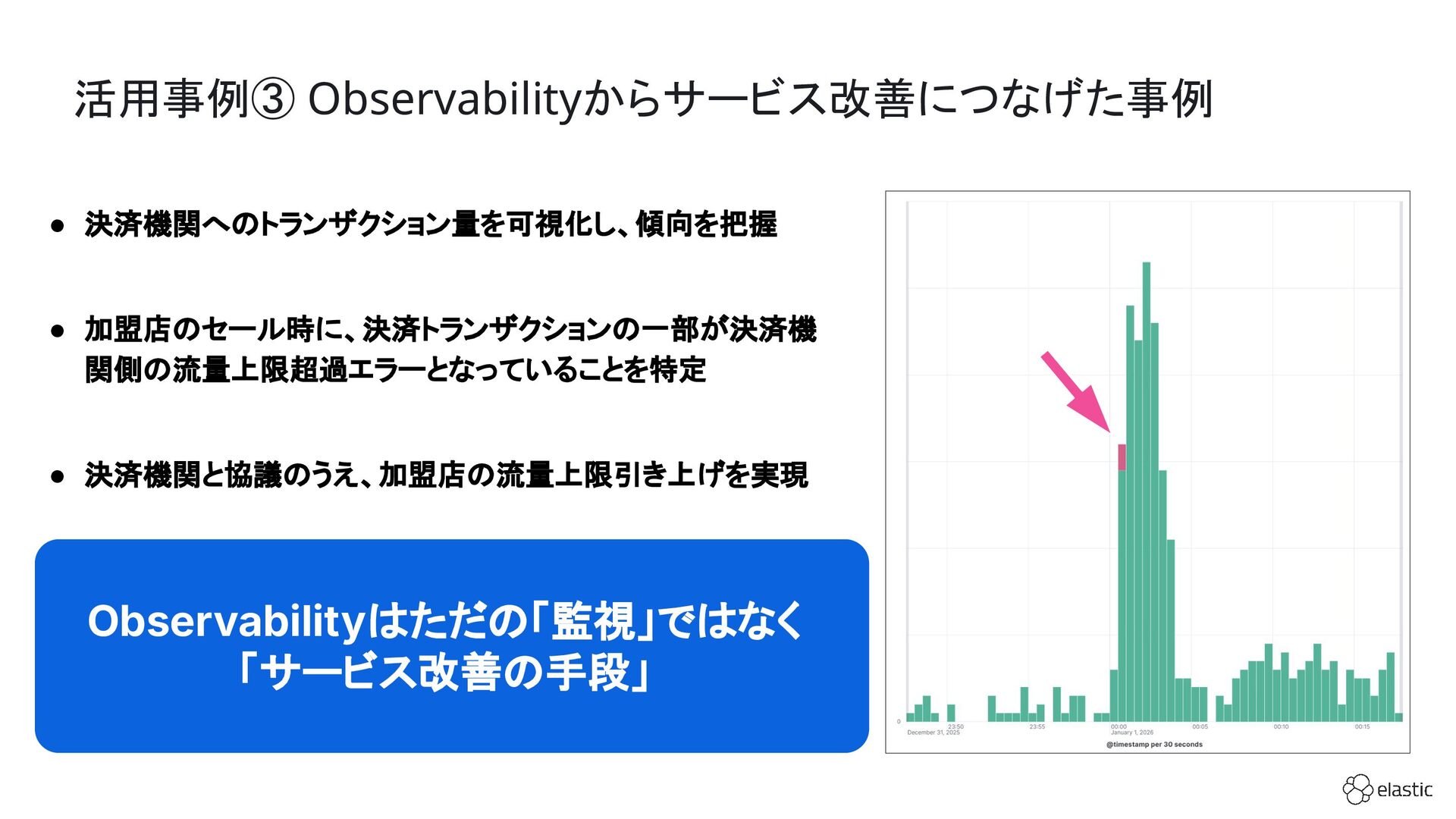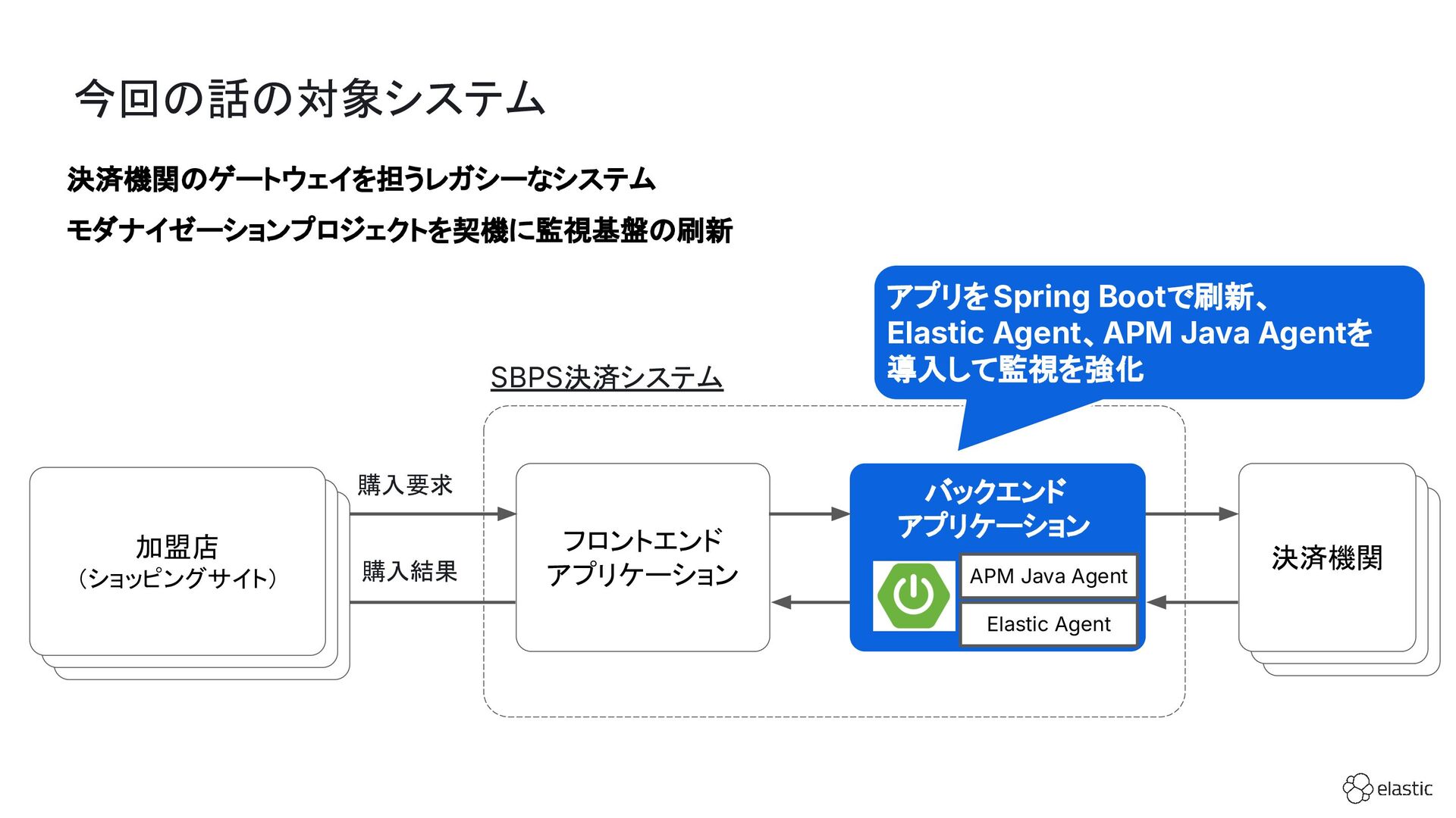 SBペイメントサービスでは、増大するログ量や運用負荷といった課題を背景に、決済サービスを支えるログ基盤をElastic Cloudへ段階的に移行しています。本セッション前半では、移行に至った背景や進め方、移行プロジェクトで直面した課題とそれに対する工夫についてご紹介します。後半では、実際に決済サービスの監視で活用しているダッシュボードを例に、Elastic AgentやAPMを用いたオブザーバビリティの実践的な取り組みをお伝えします。