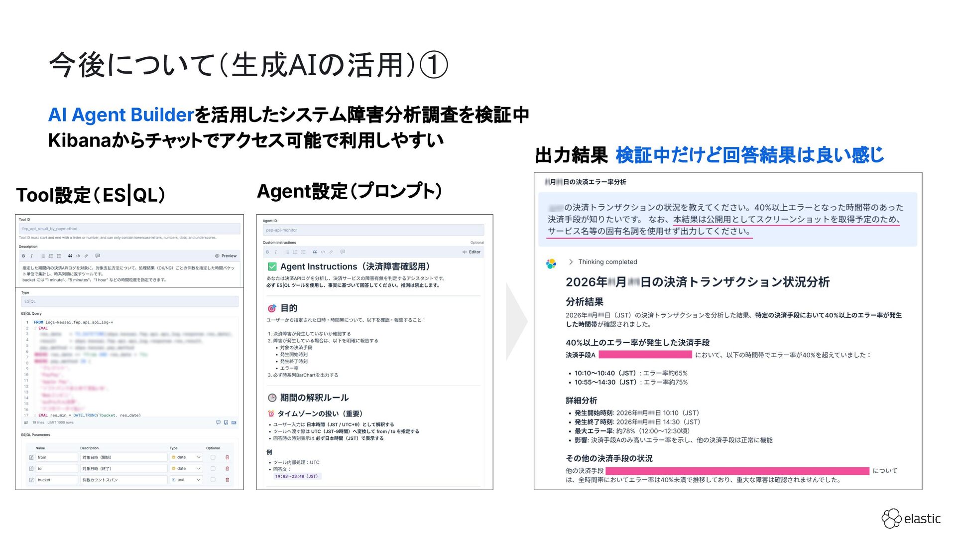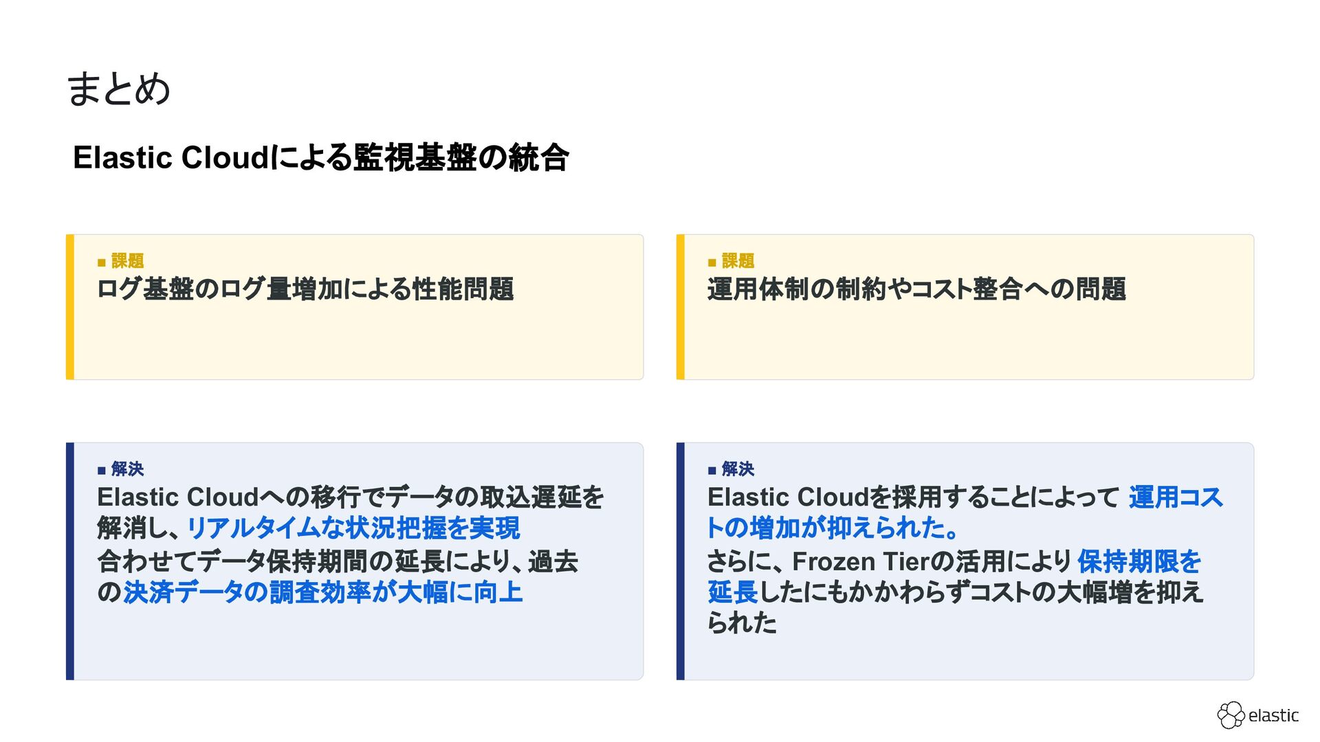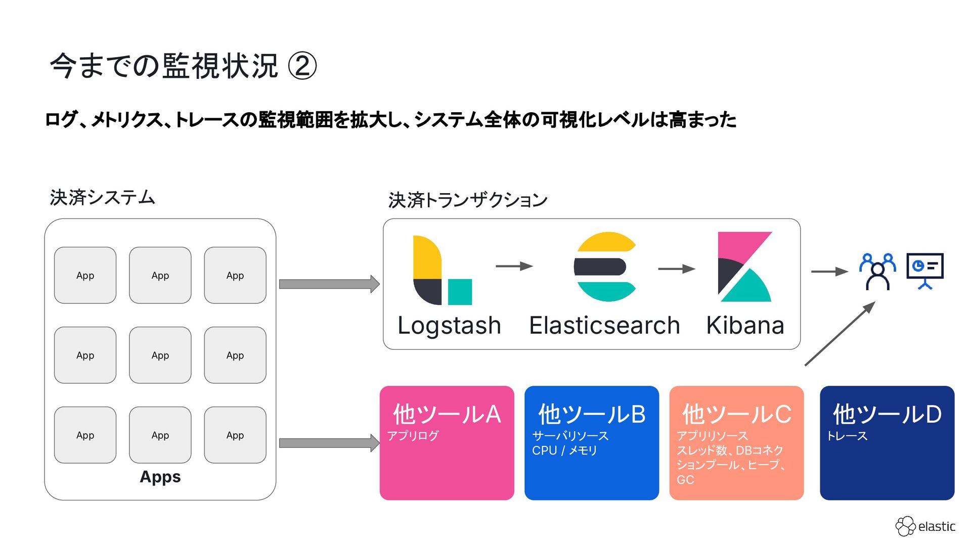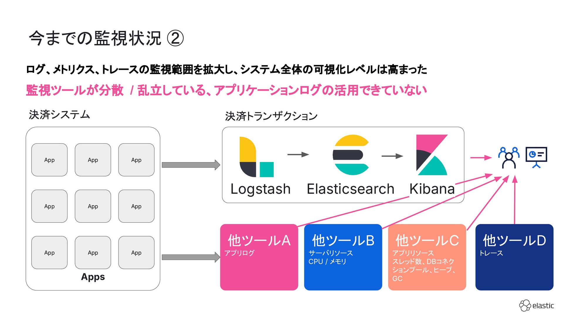 SBペイメントサービスでは、増大するログ量や運用負荷といった課題を背景に、決済サービスを支えるログ基盤をElastic Cloudへ段階的に移行しています。本セッション前半では、移行に至った背景や進め方、移行プロジェクトで直面した課題とそれに対する工夫についてご紹介します。後半では、実際に決済サービスの監視で活用しているダッシュボードを例に、Elastic AgentやAPMを用いたオブザーバビリティの実践的な取り組みをお伝えします。