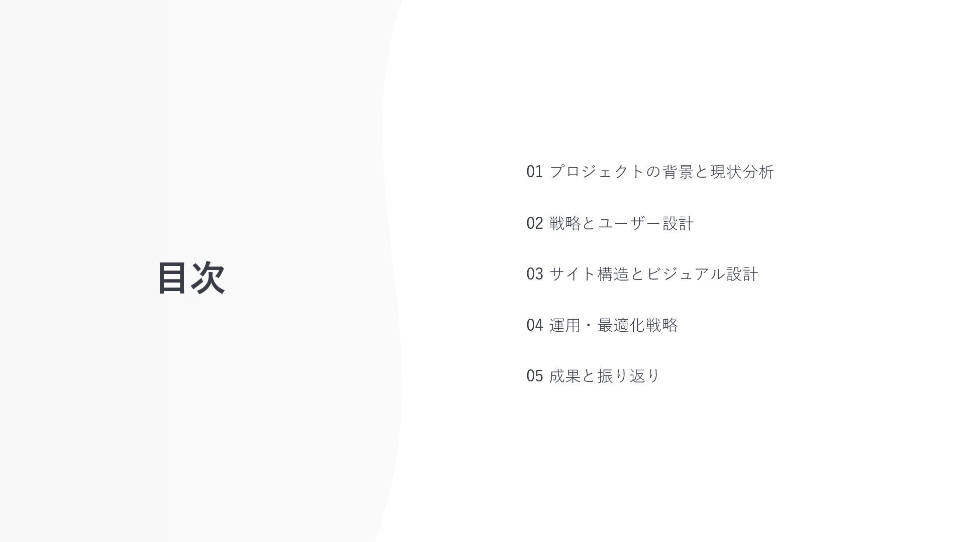 目次 01 プロジェクトの背景と現状分析 02 戦略とユーザー設計 03 サイト構造とビジュアル設計 04 運用・最適化戦略 05