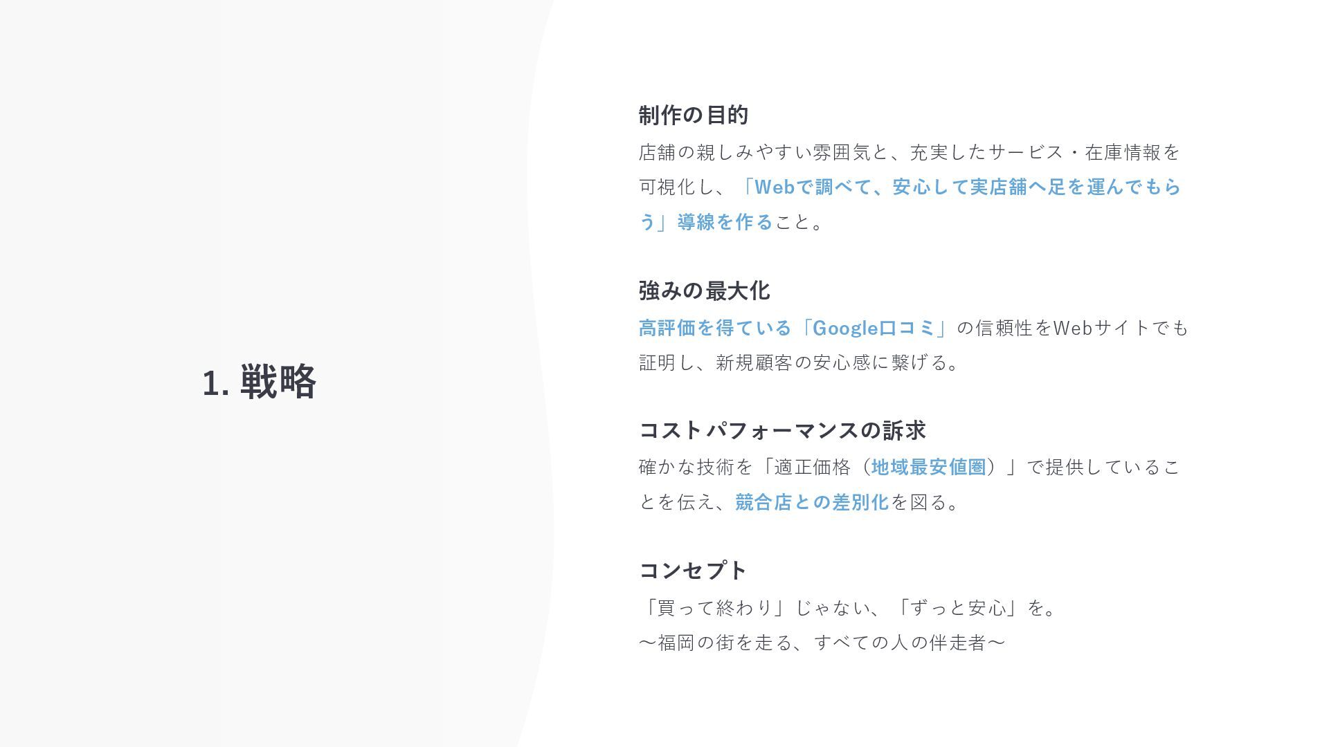 確かな技術を「適正価格(地域最安値圏)」で提供しているこ とを伝え、競合店との差別化を図る。 コンセプト 「買って終わり」じゃない、「ずっと安心」を。 〜福岡の街を走る、すべての人の伴走者〜