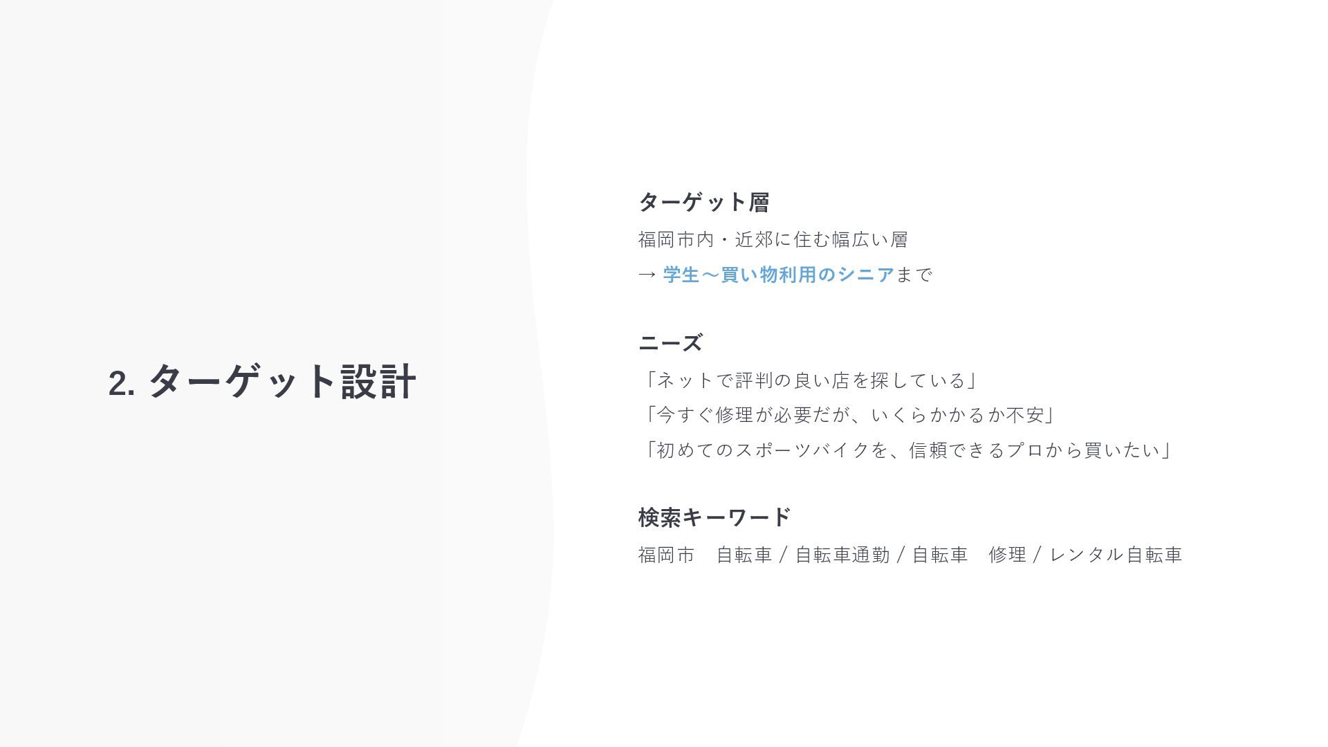 2. ターゲット設計 ターゲット層 福岡市内・近郊に住む幅広い層 → 学生〜買い物利用のシニアまで ニーズ 「ネットで評判の良い店を探している」 「今すぐ修理が必要だが、いくらかかるか不安」 「初めてのスポーツバイクを、信頼できるプロから買いたい」