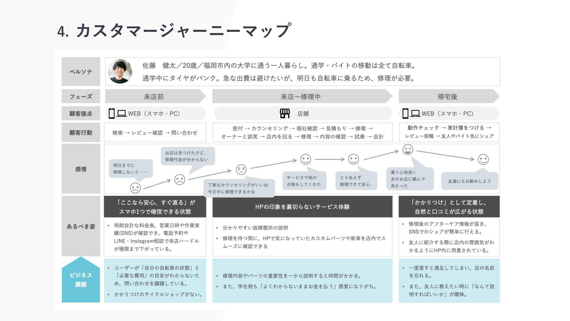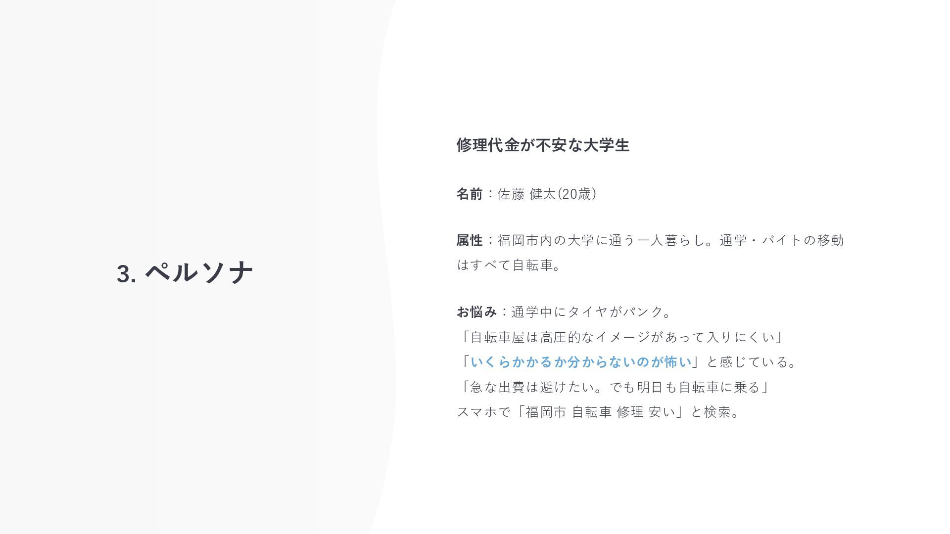 3. ペルソナ 修理代金が不安な大学生 名前:佐藤 健太(20歳) 属性:福岡市内の大学に通う一人暮らし。通学・バイトの移動 はすべて自転車。 お悩み:通学中にタイヤがパンク。 「自転車屋は高圧的なイメージがあって入りにくい」 「いくらかかるか分からないのが怖い」と感じている。
