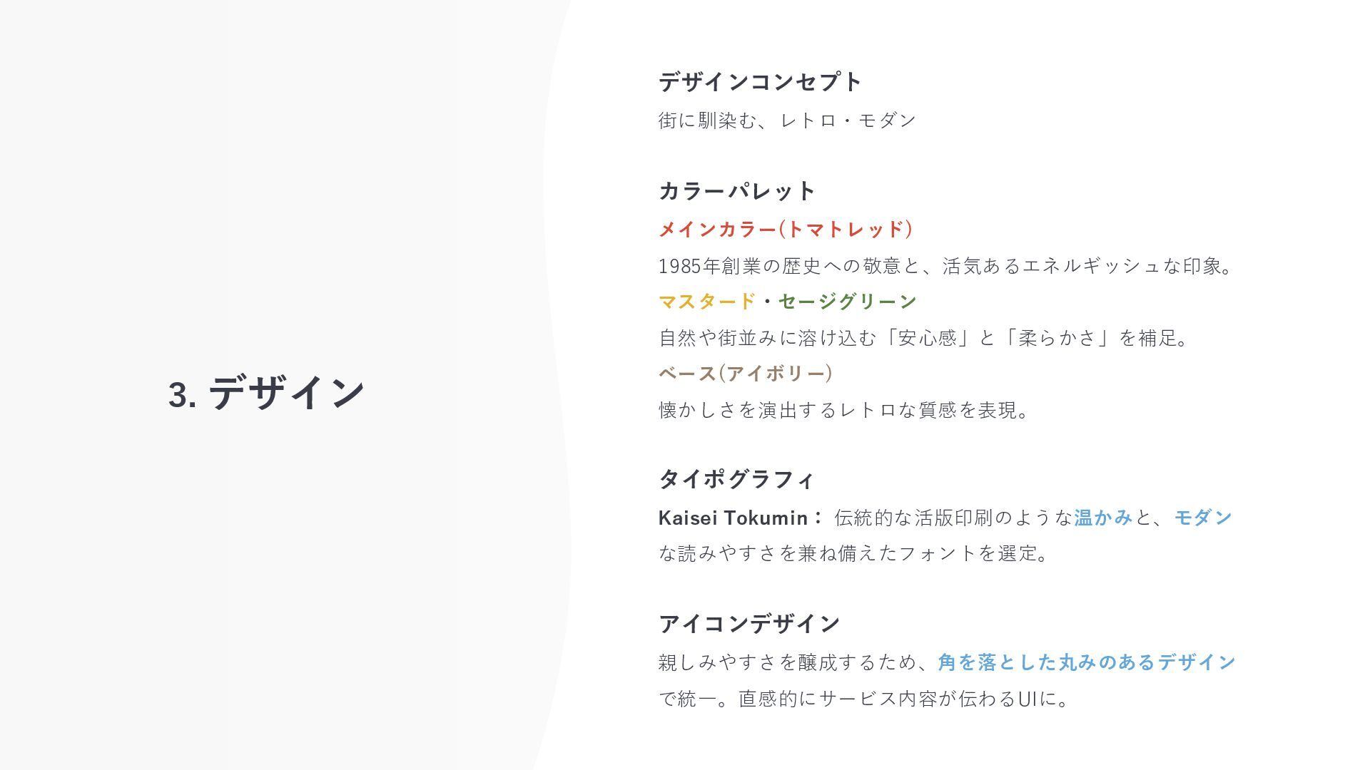 3. デザイン デザインコンセプト 街に馴染む、レトロ・モダン カラーパレット メインカラー(トマトレッド) 1985年創業の歴史への敬意と、活気あるエネルギッシュな印象。 マスタード・セージグリーン 自然や街並みに溶け込む「安心感」と「柔らかさ」を補足。 ベース(アイボリー)