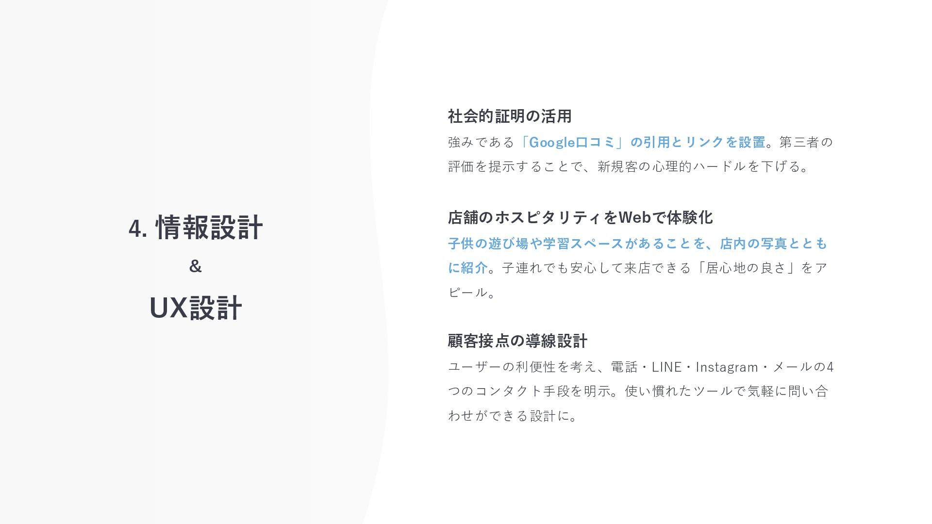 社会的証明の活用 強みである「Google口コミ」の引用とリンクを設置。第三者の 評価を提示することで、新規客の心理的ハードルを下げる。 店舗のホスピタリティをWebで体験化 子供の遊び場や学習スペースがあることを、店内の写真ととも に紹介。子連れでも安心して来店できる「居心地の良さ」をア ピール。 顧客接点の導線設計 ユーザーの利便性を考え、電話・LINE・Instagram・メールの4 つのコンタクト手段を明示。使い慣れたツールで気軽に問い合