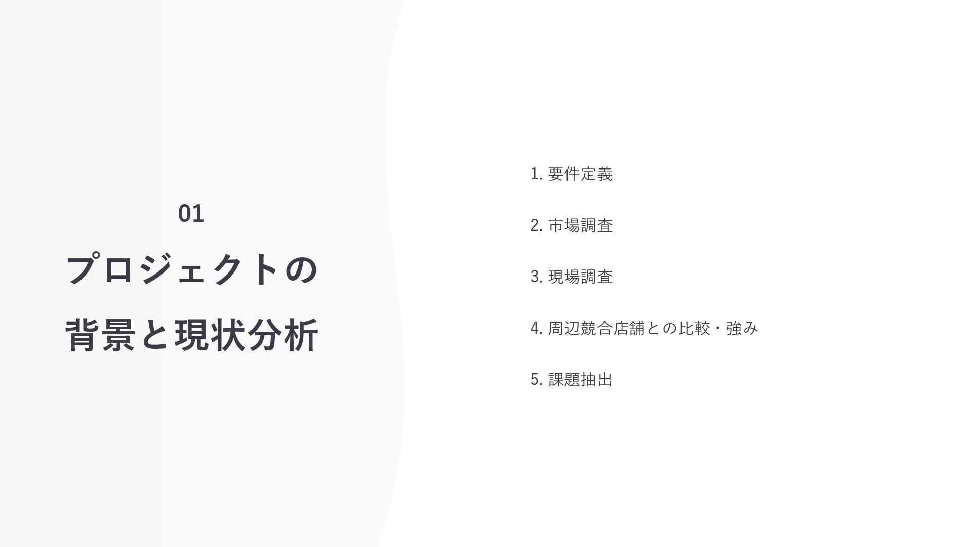 01 プロジェクトの 背景と現状分析 1. 要件定義 2. 市場調査 3. 現場調査 4.