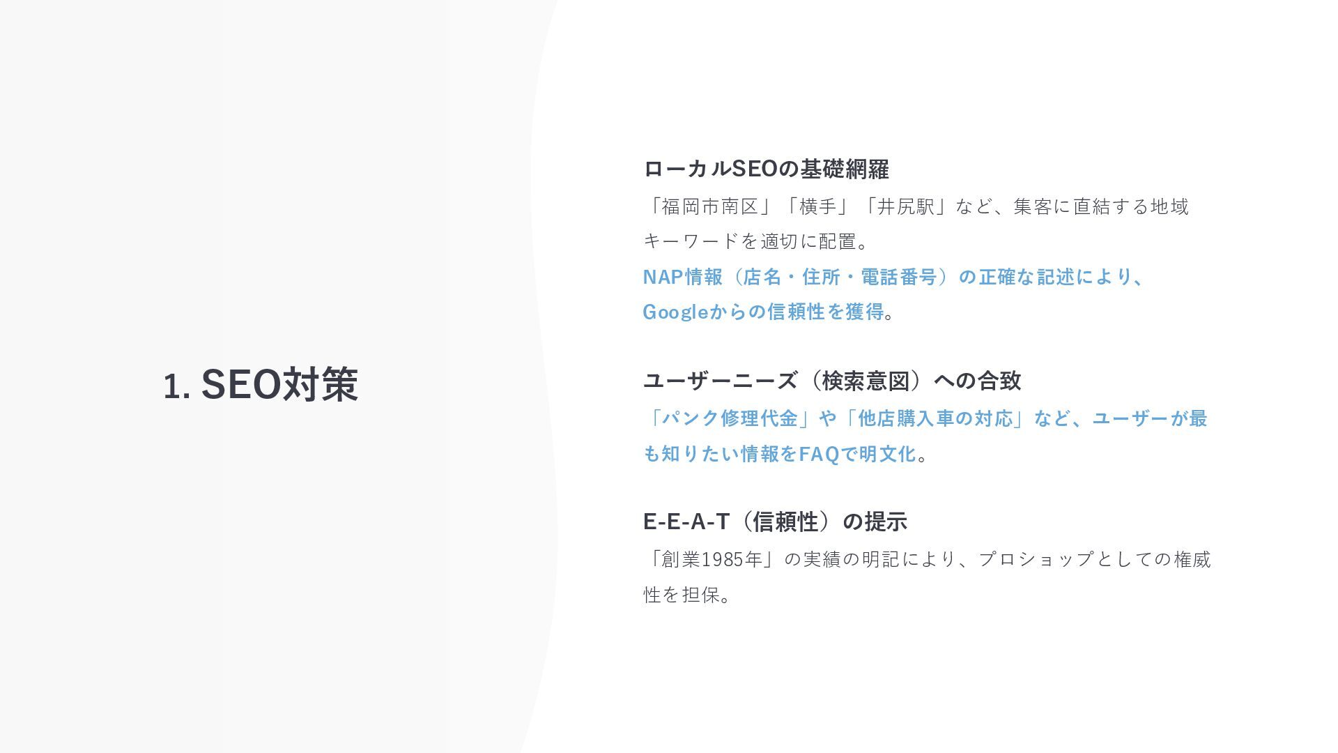 1. SEO対策 ローカルSEOの基礎網羅 「福岡市南区」「横手」「井尻駅」など、集客に直結する地域 キーワードを適切に配置。 NAP情報(店名・住所・電話番号)の正確な記述により、 Googleからの信頼性を獲得。 ユーザーニーズ(検索意図)への合致 「パンク修理代金」や「他店購入車の対応」など、ユーザーが最 も知りたい情報をFAQで明文化。