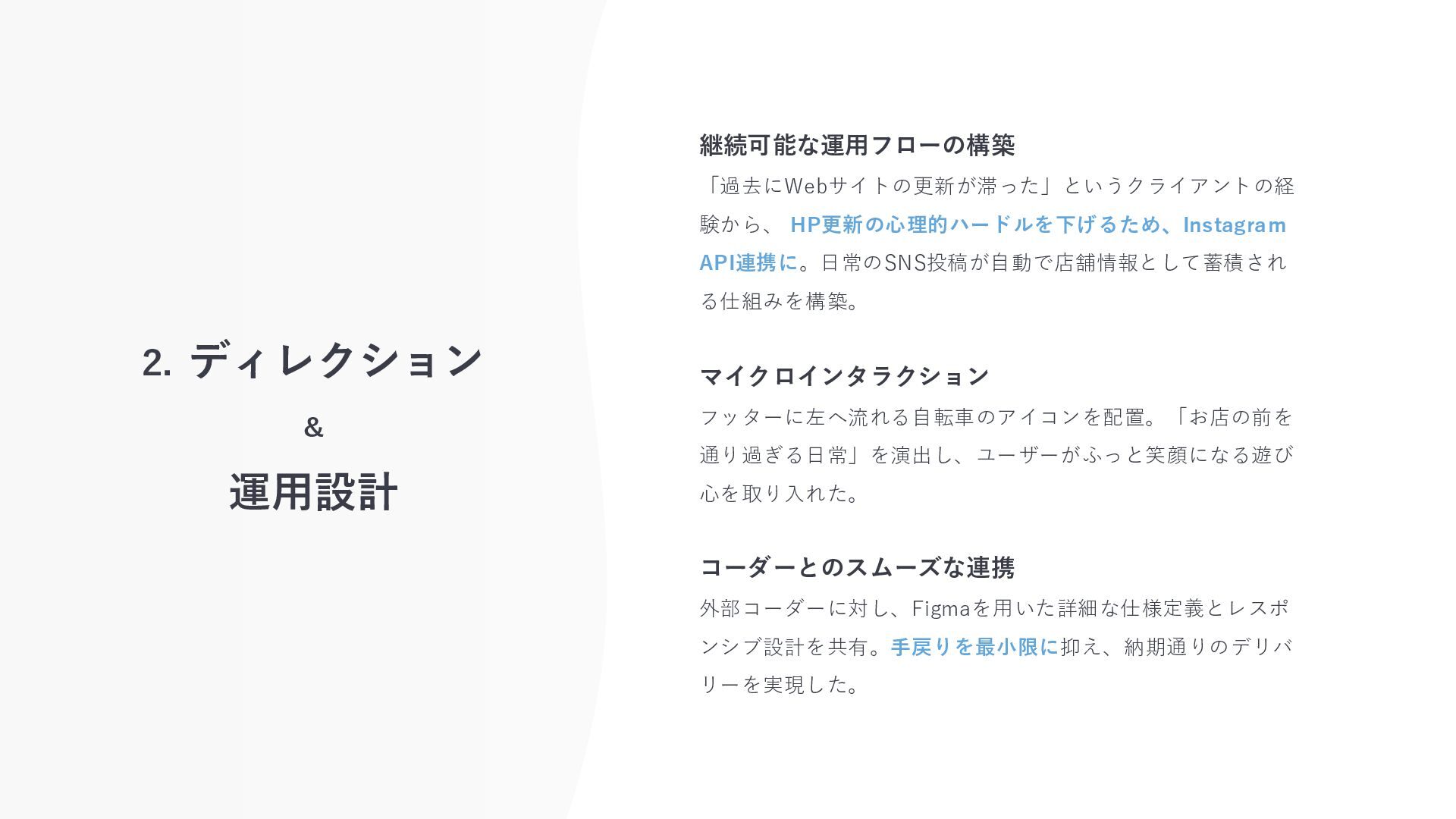 2. ディレクション & 運用設計 継続可能な運用フローの構築 「過去にWebサイトの更新が滞った」というクライアントの経 験から、 HP更新の心理的ハードルを下げるため、Instagram API連携に。日常のSNS投稿が自動で店舗情報として蓄積され る仕組みを構築。