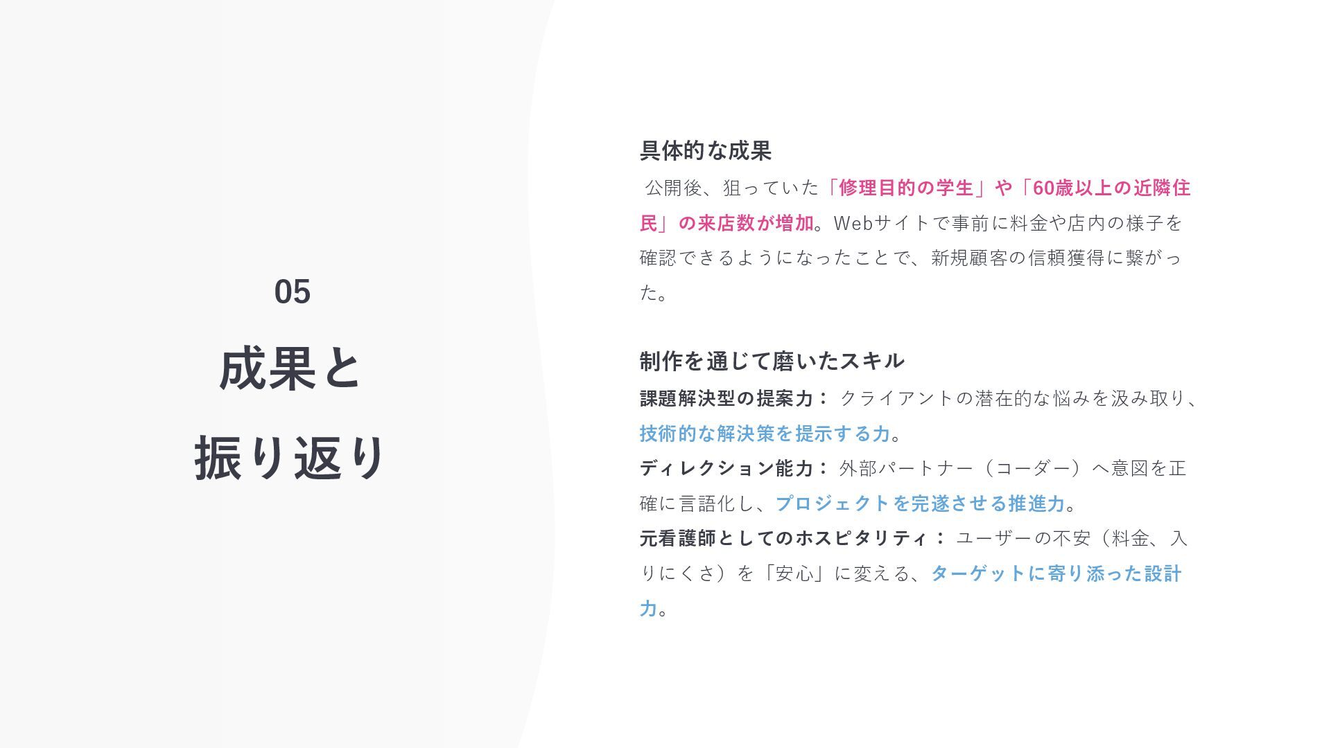 05 成果と 振り返り 具体的な成果 公開後、狙っていた「修理目的の学生」や「60歳以上の近隣住 民」の来店数が増加。Webサイトで事前に料金や店内の様子を 確認できるようになったことで、新規顧客の信頼獲得に繋がっ た。 制作を通じて磨いたスキル 課題解決型の提案力: