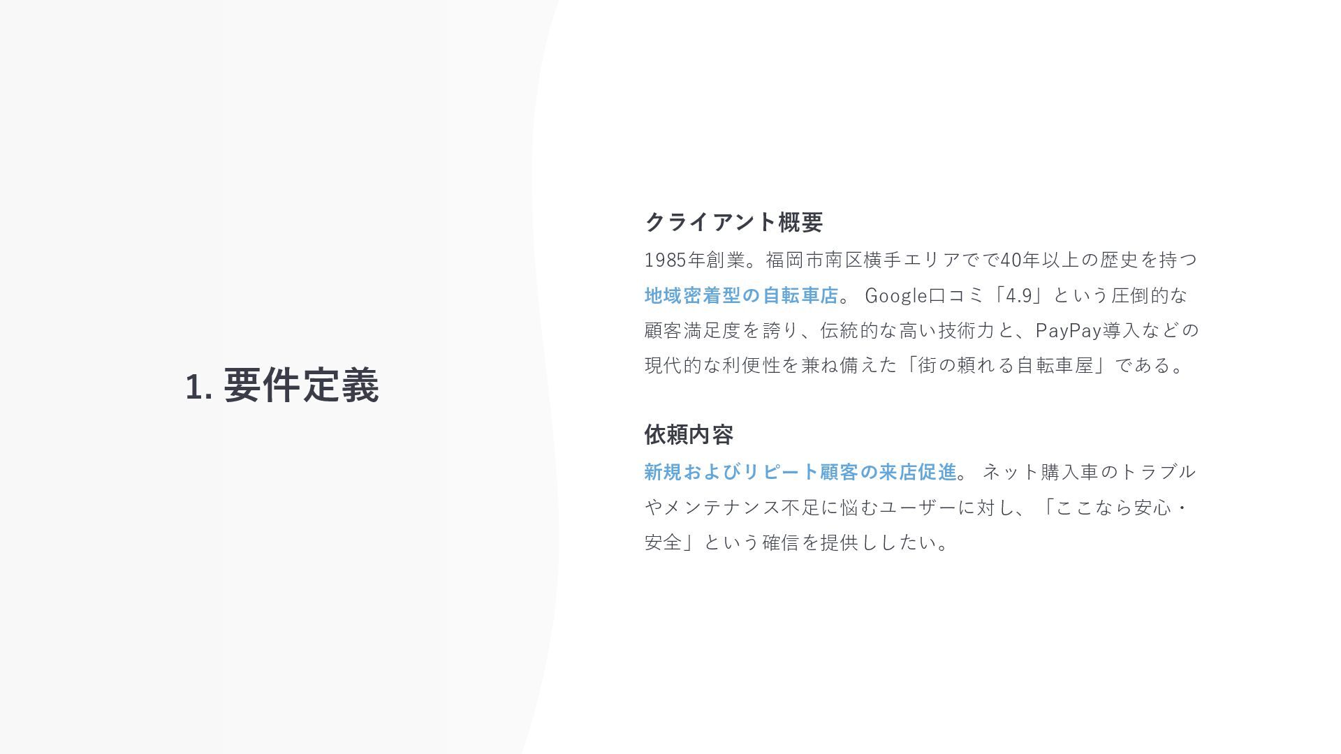 1. 要件定義 クライアント概要 1985年創業。福岡市南区横手エリアでで40年以上の歴史を持つ 地域密着型の自転車店。 Google口コミ「4.9」という圧倒的な 顧客満足度を誇り、伝統的な高い技術力と、PayPay導入などの 現代的な利便性を兼ね備えた「街の頼れる自転車屋」である。 依頼内容 新規およびリピート顧客の来店促進。
