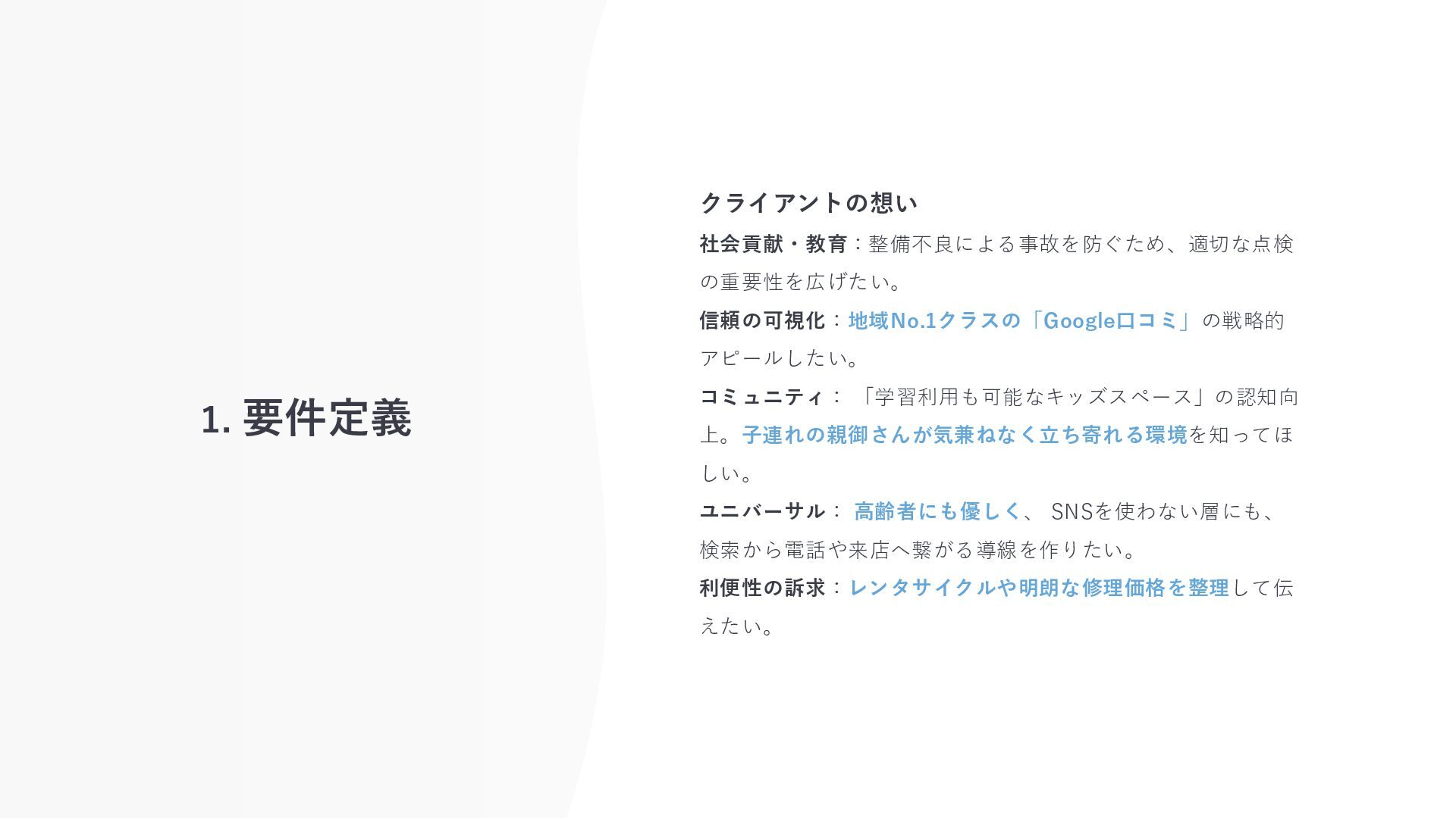 1. 要件定義 クライアントの想い 社会貢献・教育:整備不良による事故を防ぐため、適切な点検 の重要性を広げたい。 信頼の可視化:地域No.1クラスの「Google口コミ」の戦略的 アピールしたい。 コミュニティ: 「学習利用も可能なキッズスペース」の認知向 上。子連れの親御さんが気兼ねなく立ち寄れる環境を知ってほ