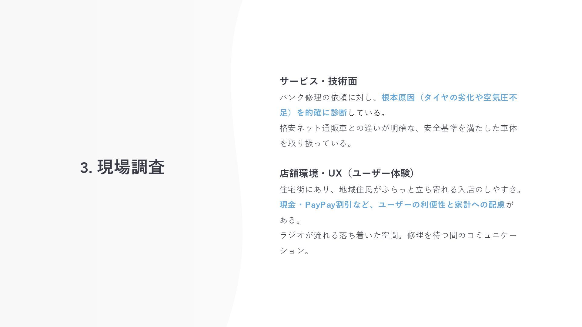 3. 現場調査 サービス・技術面 パンク修理の依頼に対し、根本原因(タイヤの劣化や空気圧不 足)を的確に診断している。 格安ネット通販車との違いが明確な、安全基準を満たした車体 を取り扱っている。 店舗環境・UX(ユーザー体験) 住宅街にあり、地域住民がふらっと立ち寄れる入店のしやすさ。 現金・PayPay割引など、ユーザーの利便性と家計への配慮が