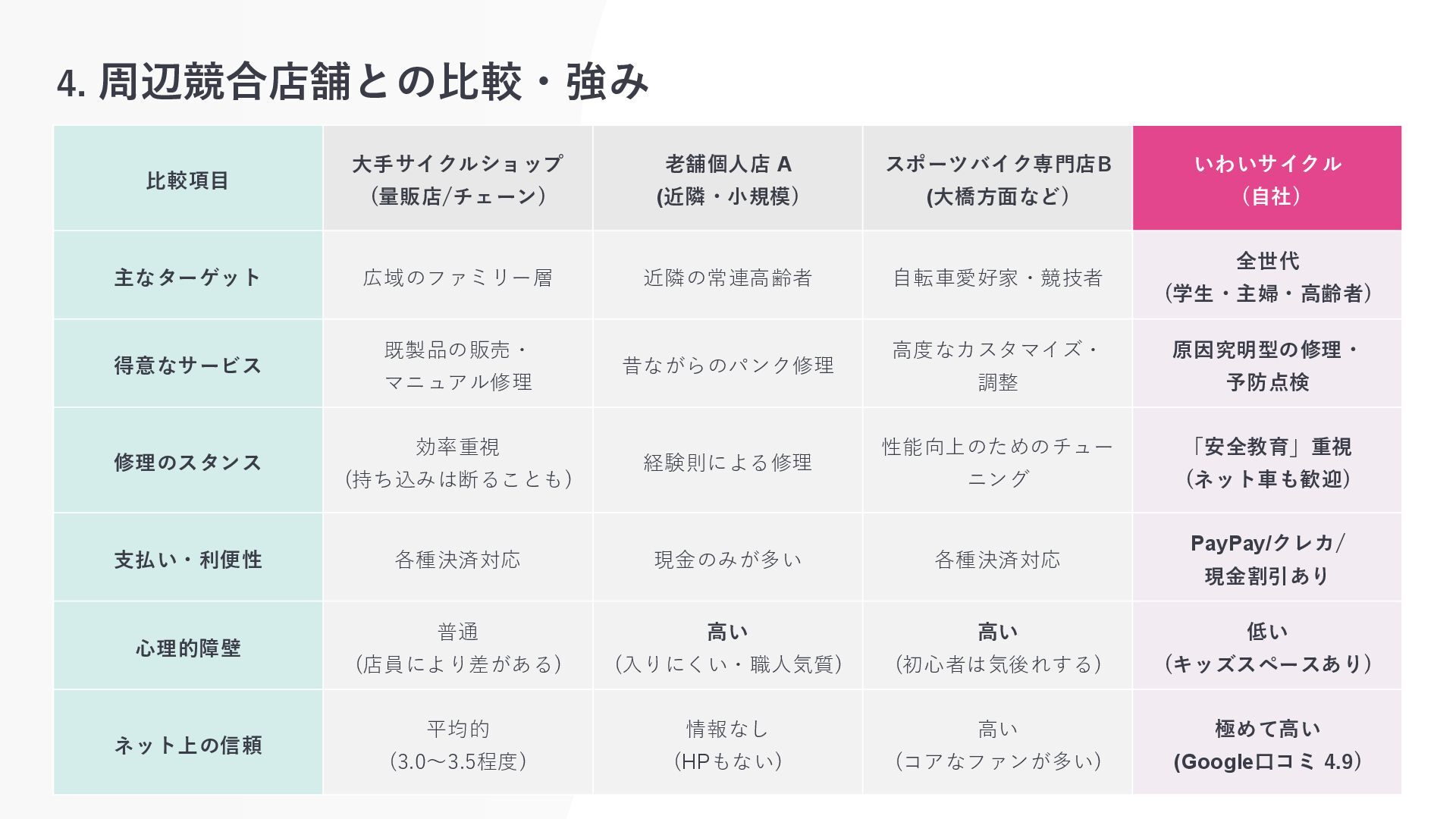 4. 周辺競合店舗との比較・強み 比較項目 大手サイクルショップ (量販店/チェーン) 老舗個人店 A (近隣・小規模) スポーツバイク専門店B (大橋方面など)