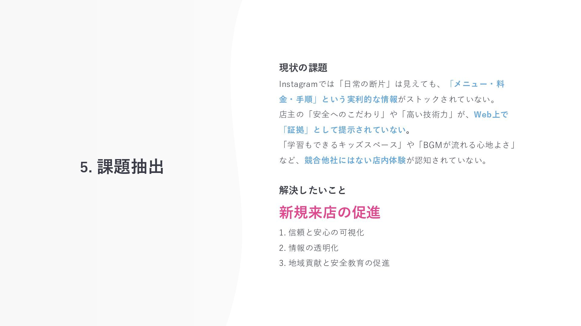 5. 課題抽出 現状の課題 Instagramでは「日常の断片」は見えても、「メニュー・料 金・手順」という実利的な情報がストックされていない。 店主の「安全へのこだわり」や「高い技術力」が、Web上で 「証拠」として提示されていない。 「学習もできるキッズスペース」や「BGMが流れる心地よさ」 など、競合他社にはない店内体験が認知されていない。 解決したいこと