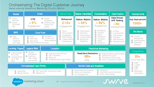 Decisions 8B+ Predictive Marketing Daily Conversation! Native Mobile ~ 89% Engagement! ! þ WYSIWYG! þ Surveys! þ Video! þ Feedback! þ Purchase! þ Alerts! þ Real-time Optimization þ UI Flow! þ Look and Feel! þ Onboarding! þ Checkout! þ Offers/Pricing! þ Virtual Economy! 2-10x Swrve Push! Swrve Push þ Inbox! þ Geo-Location! þ Localization! þ Deep-linking! þ Trigger Native Conversation! Engagement Data Driven A/B Testing ~4x Improvements App Deployments 1000+ CTR ~ 5% Email Mobile Data and Analytics þ Attribution! þ Key Performance Indicators! þ Churn, Monetization! þ Bayesian Multi-variant testing ! þ Optimal time push! þ Predictive Lead Scoring! þ Churn, Conversion, Spend! Native Mobile ~ 34% Engagement! ! þ Pixel Perfect! þ Real-time! þ Deep-linking! þ Customizable! þ Behavioral triggering þ DMP! þ Loyalty! þ CRM! þ ESP! þ Marketing Automation! Integrations 20+ Out of the Box þ Real-time Geo-Fencing! þ GEO Targeting ! þ iBeacons! þ Integrated with segmentation! Orchestrated User Profile þ 360O view web, email and mobile! þ Always Live! Engagement þ = significant added functionality from Swrve! þ Deep Data and Analytics! þ End-to-end reporting! þ LTV, Engagement! þ Streaming! þ Mobile Centric! Orchestrating The Digital Customer Journey! Swrve extends Salesforce Marketing Cloud to Mobile! Native Interstitial Enhanced Landing Pages Location þ Mobile Integration! þ Enriched with mobile user profile! þ Mobile Integration! þ Enriched with mobile user profile! Integrations! þ Social listening! þ Social Campaign! Dev.! þ SMS Delivery Triggered by In App! þ Landing page for e-mail! þ Landing Page for In App Msg.! þ Custom Integrations! þ Data Services! þ Marketing Strategy! Pro Serve þ Push! þ Rich Push! þ App Inbox! þ Cross Channel Journeys! þ Analytics! þ Locations & Beacons(beta)! Core Push © 2016 Swrve Inc.