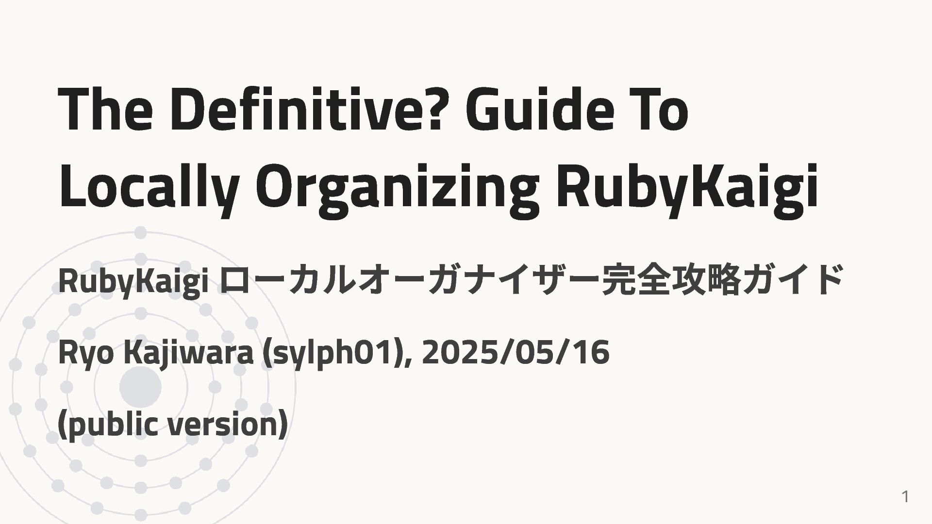 The Definitive? Guide To Locally Organizing RubyKaigi RubyKaigi ローカルオーガナイザー完全攻略ガイド Ryo