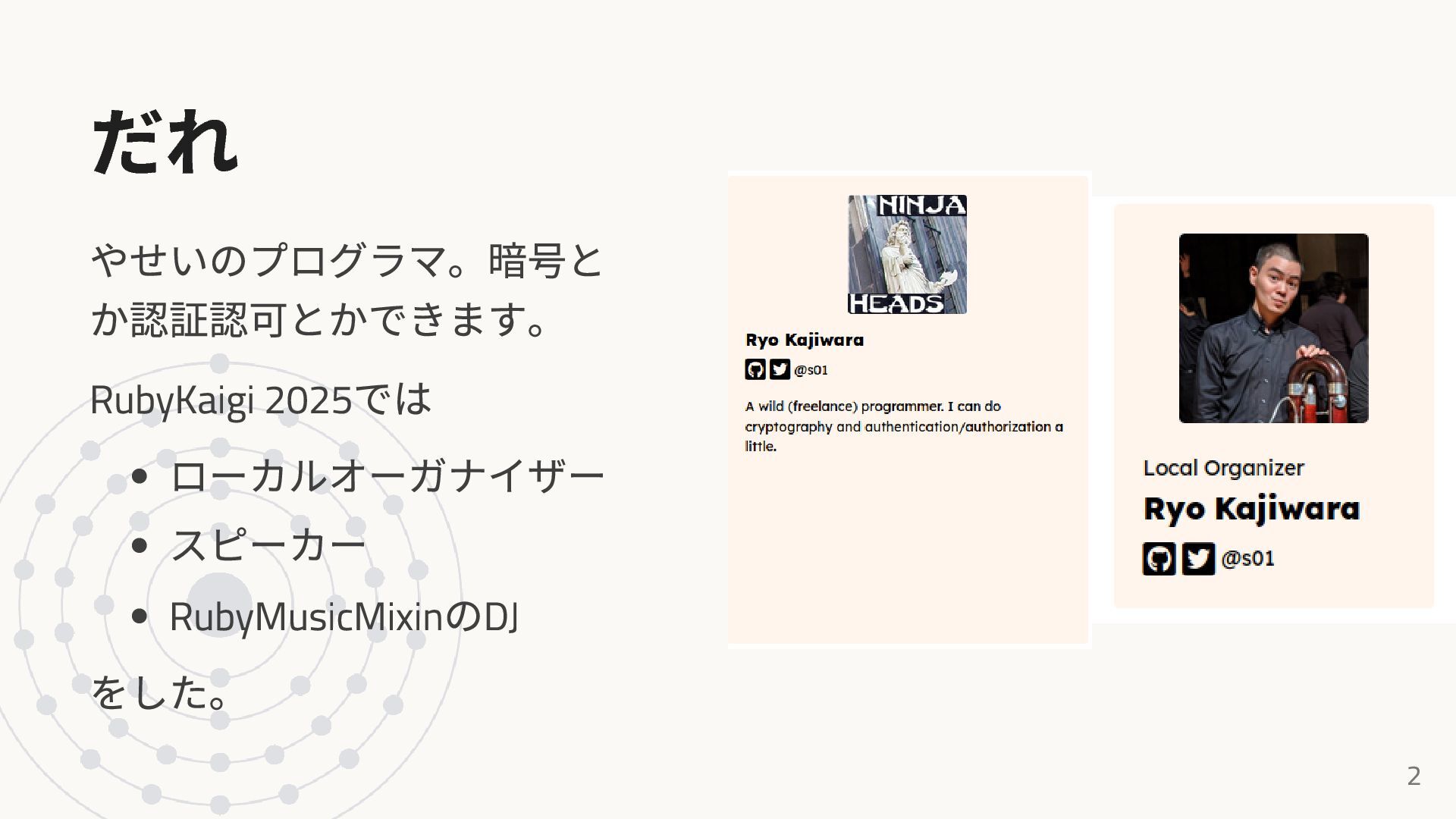 だれ やせいのプログラマ。暗号と か認証認可とかできます。 RubyKaigi 2025では ローカルオーガナイザー スピーカー RubyMusicMixinのDJ をした。 2