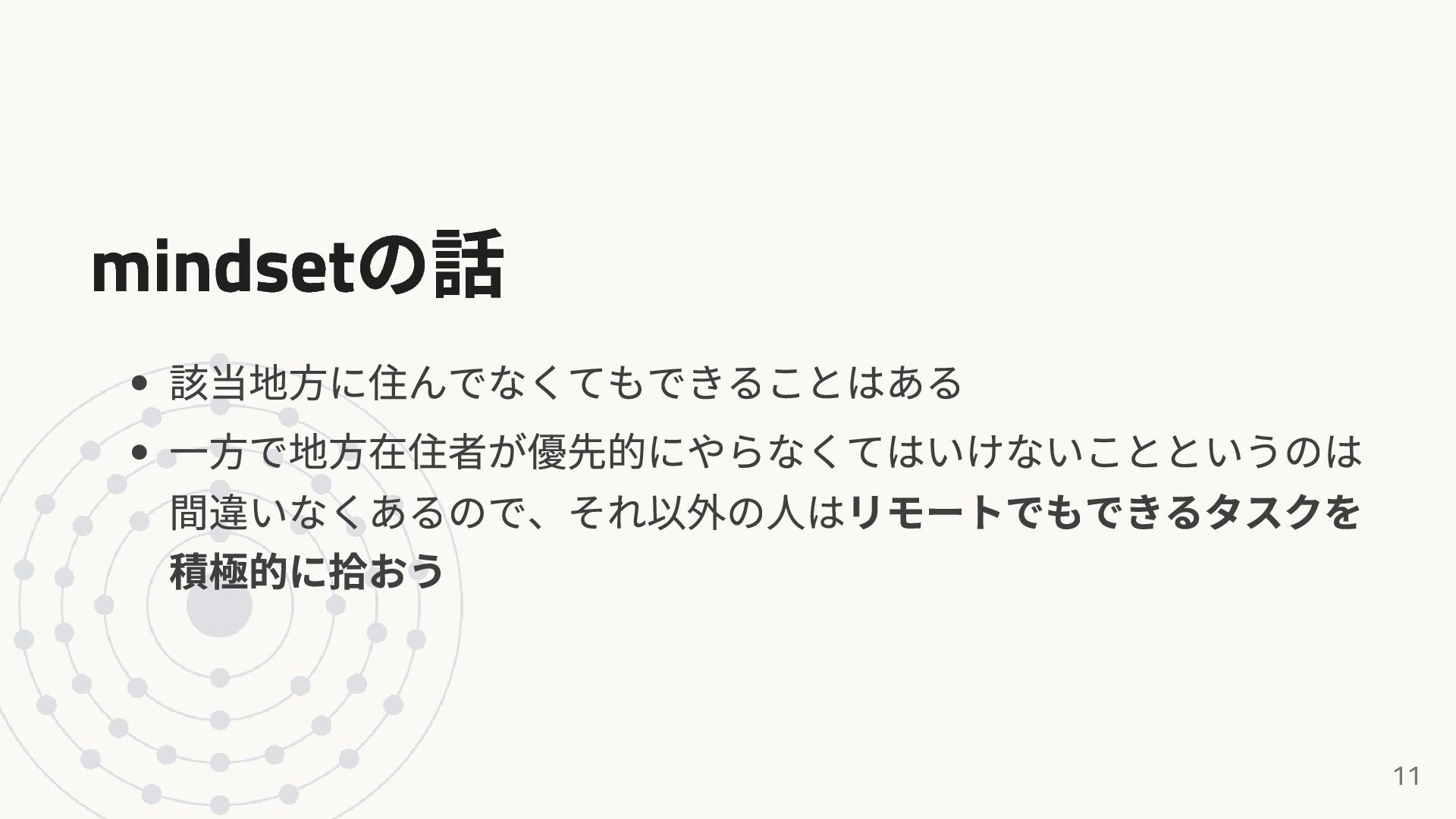 mindsetの話 該当地方に住んでなくてもできることはある 一方で地方在住者が優先的にやらなくてはいけないことというのは 間違いなくあるので、それ以外の人はリモートでもできるタスクを 積極的に拾おう 11