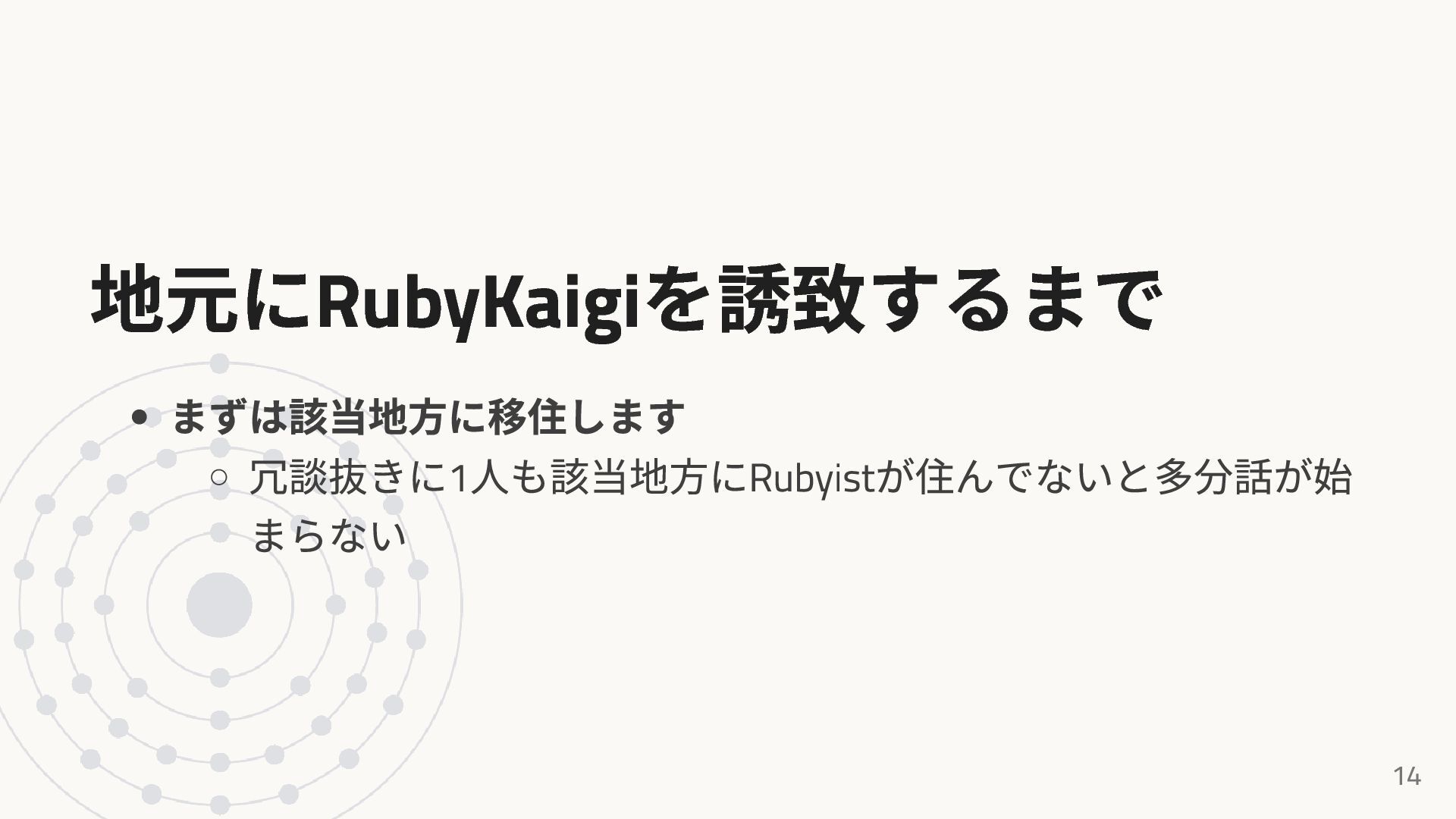 地元にRubyKaigiを誘致するまで まずは該当地方に移住します 冗談抜きに1人も該当地方にRubyistが住んでないと多分話が始 まらない 14