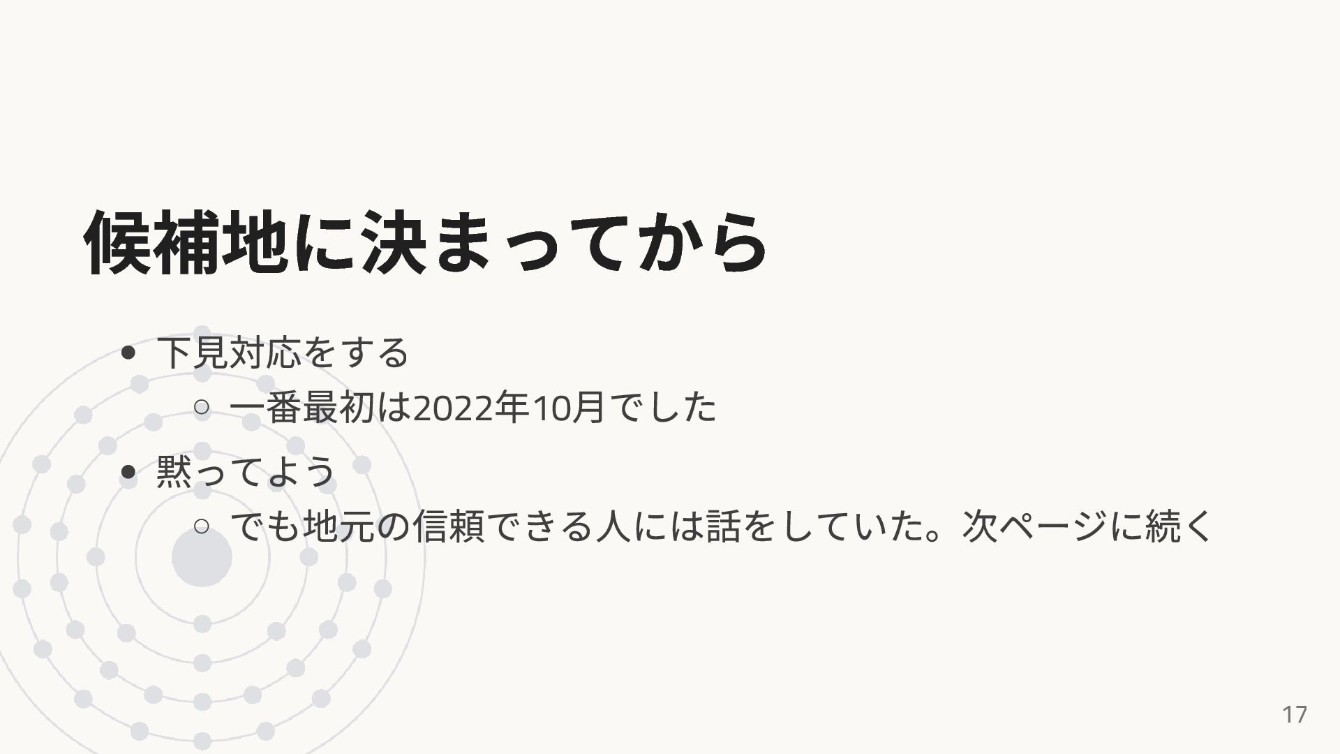 候補地に決まってから 下見対応をする 一番最初は2022年10月でした 黙ってよう でも地元の信頼できる人には話をしていた。次ページに続く 17