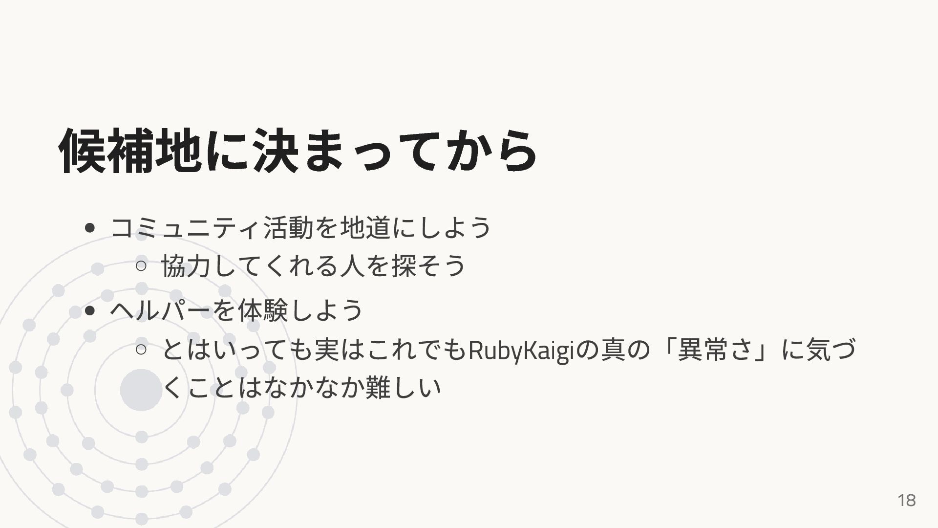 候補地に決まってから コミュニティ活動を地道にしよう 協力してくれる人を探そう ヘルパーを体験しよう とはいっても実はこれでもRubyKaigiの真の「異常さ」に気づ くことはなかなか難しい 18