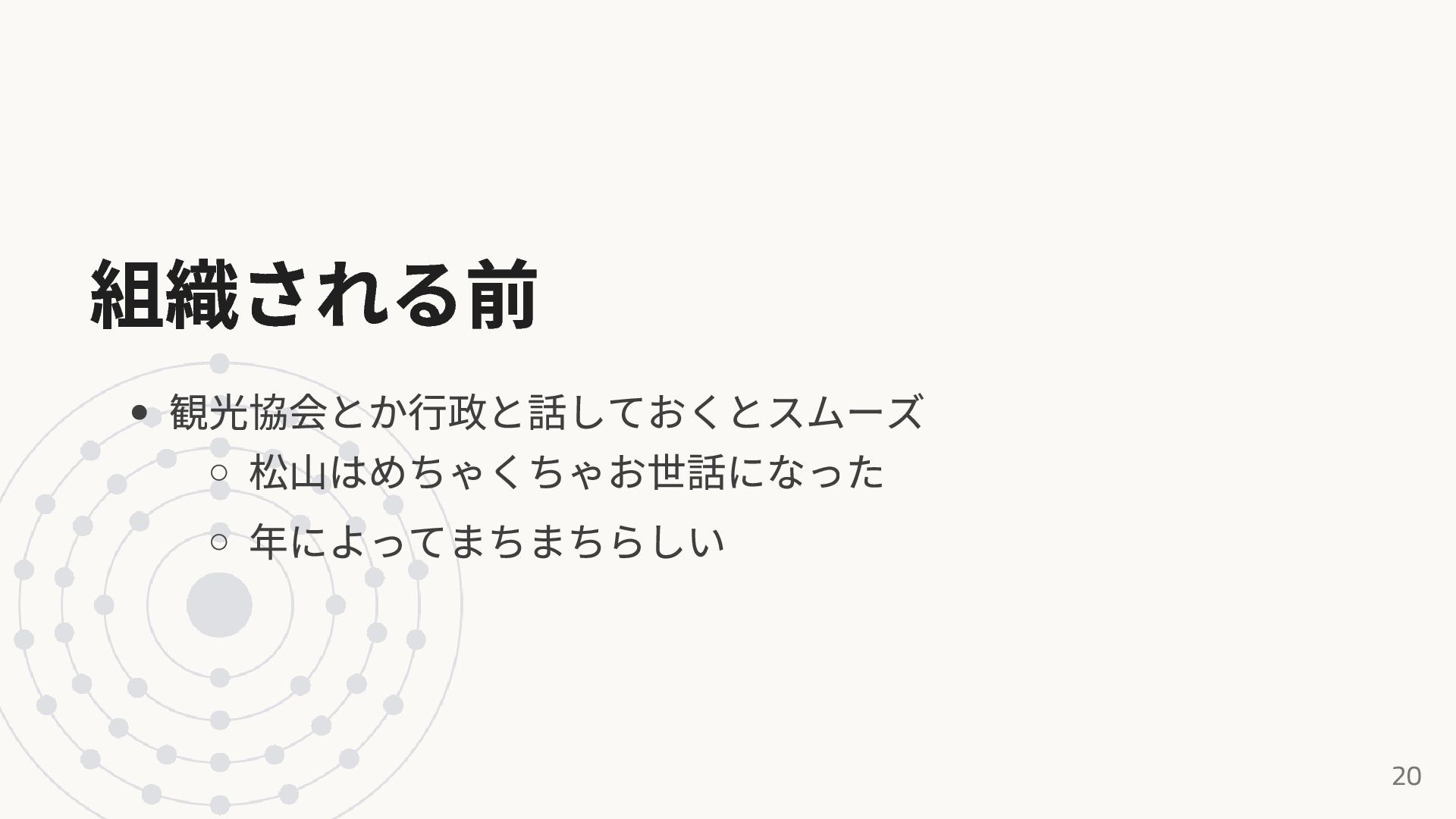 組織される前 観光協会とか行政と話しておくとスムーズ 松山はめちゃくちゃお世話になった 年によってまちまちらしい 20