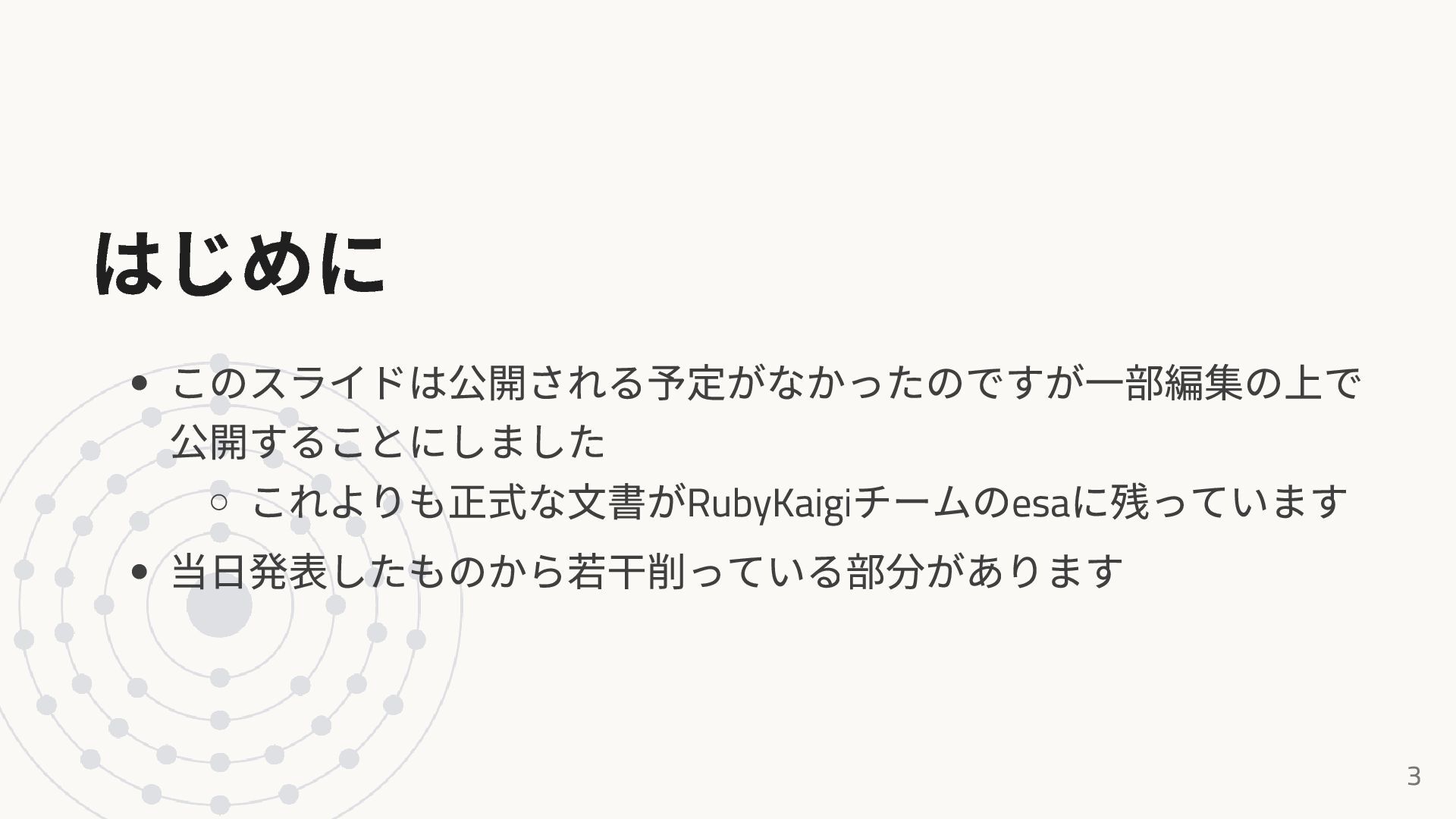 はじめに このスライドは公開される予定がなかったのですが一部編集の上で 公開することにしました これよりも正式な文書がRubyKaigiチームのesaに残っています 当日発表したものから若干削っている部分があります 3