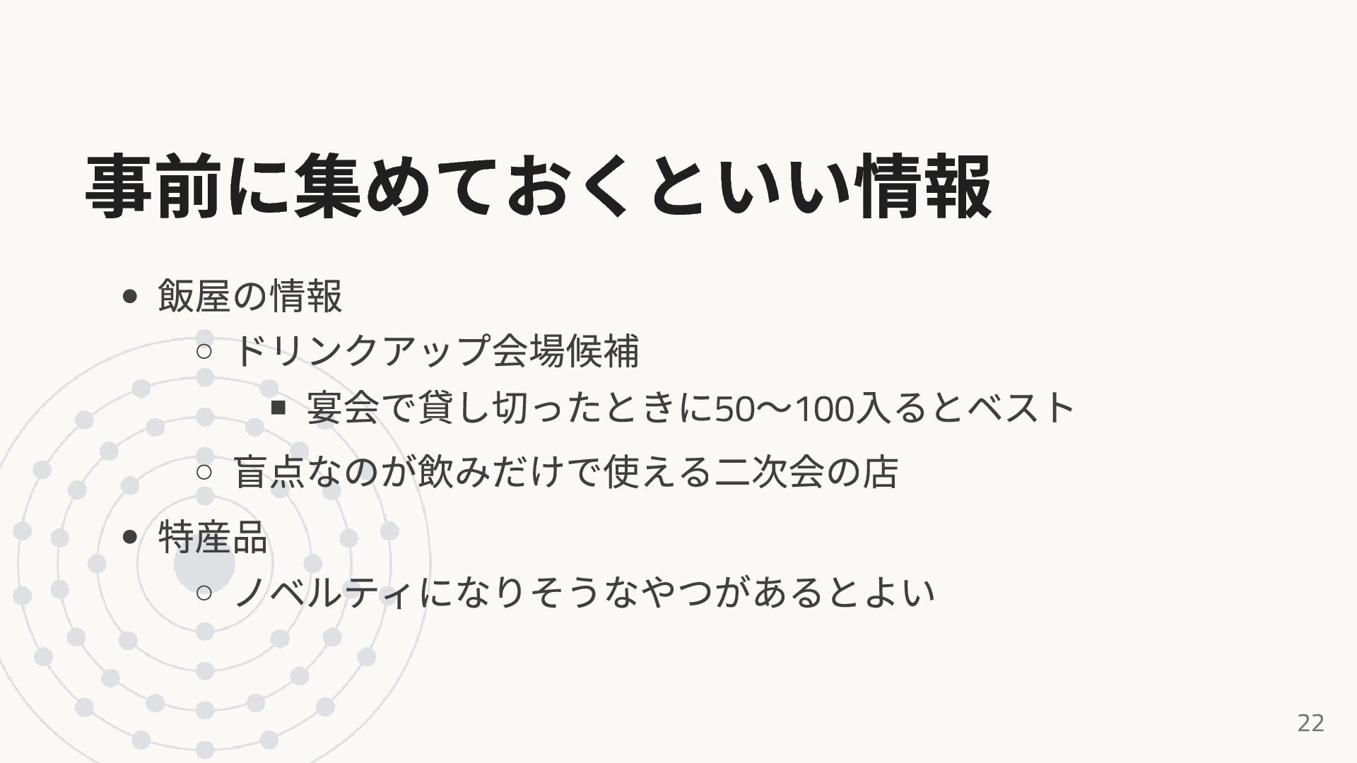 事前に集めておくといい情報 飯屋の情報 ドリンクアップ会場候補 宴会で貸し切ったときに50〜100入るとベスト 盲点なのが飲みだけで使える二次会の店 特産品 ノベルティになりそうなやつがあるとよい 22