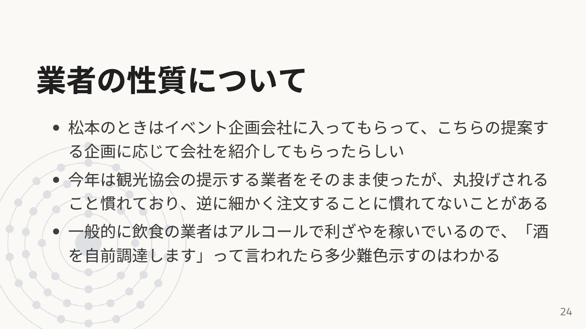 業者の性質について 松本のときはイベント企画会社に入ってもらって、こちらの提案す る企画に応じて会社を紹介してもらったらしい 今年は観光協会の提示する業者をそのまま使ったが、丸投げされる こと慣れており、逆に細かく注文することに慣れてないことがある 一般的に飲食の業者はアルコールで利ざやを稼いでいるので、「酒 を自前調達します」って言われたら多少難色示すのはわかる 24