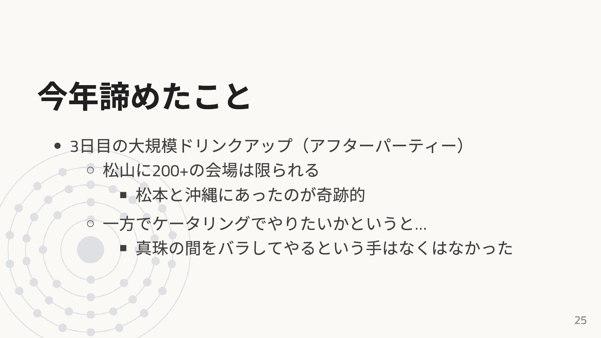 今年諦めたこと 3日目の大規模ドリンクアップ(アフターパーティー) 松山に200+の会場は限られる 松本と沖縄にあったのが奇跡的 一方でケータリングでやりたいかというと… 真珠の間をバラしてやるという手はなくはなかった 25