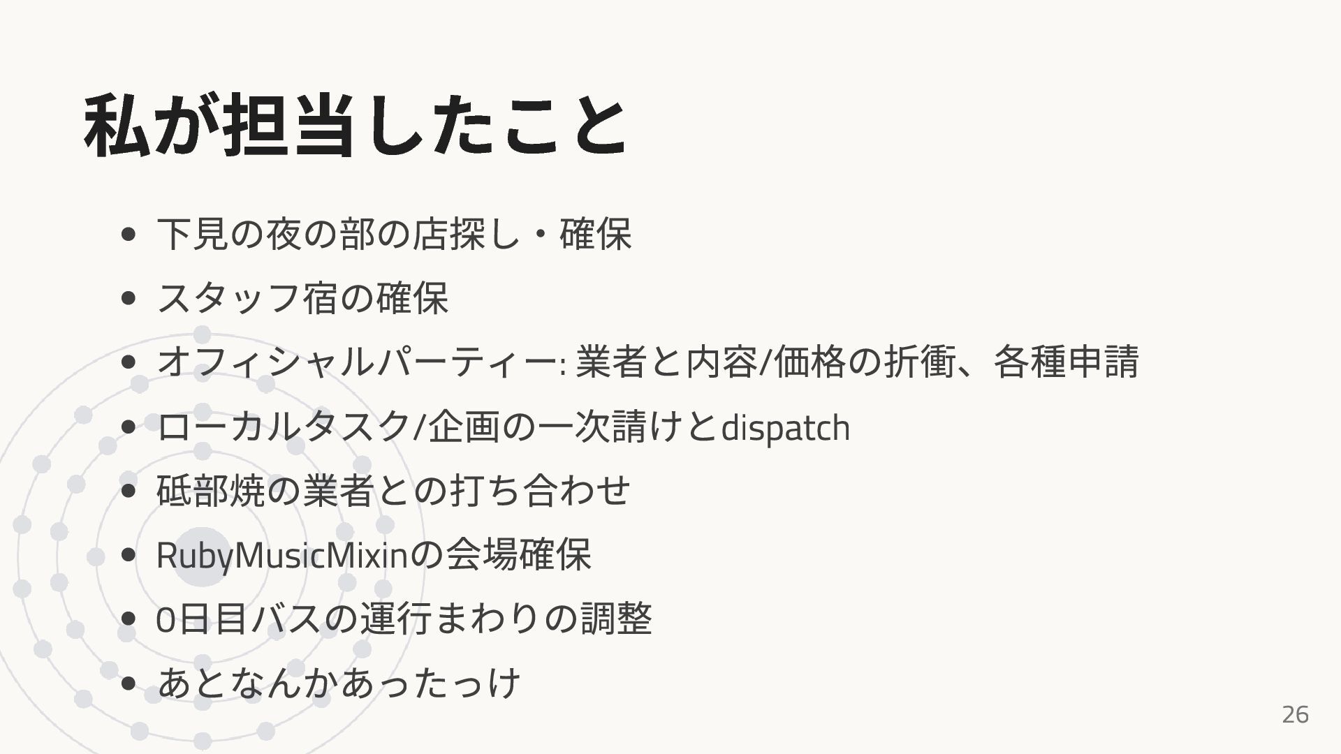 私が担当したこと 下見の夜の部の店探し・確保 スタッフ宿の確保 オフィシャルパーティー: 業者と内容/価格の折衝、各種申請 ローカルタスク/企画の一次請けとdispatch 砥部焼の業者との打ち合わせ RubyMusicMixinの会場確保 0日目バスの運行まわりの調整 あとなんかあったっけ