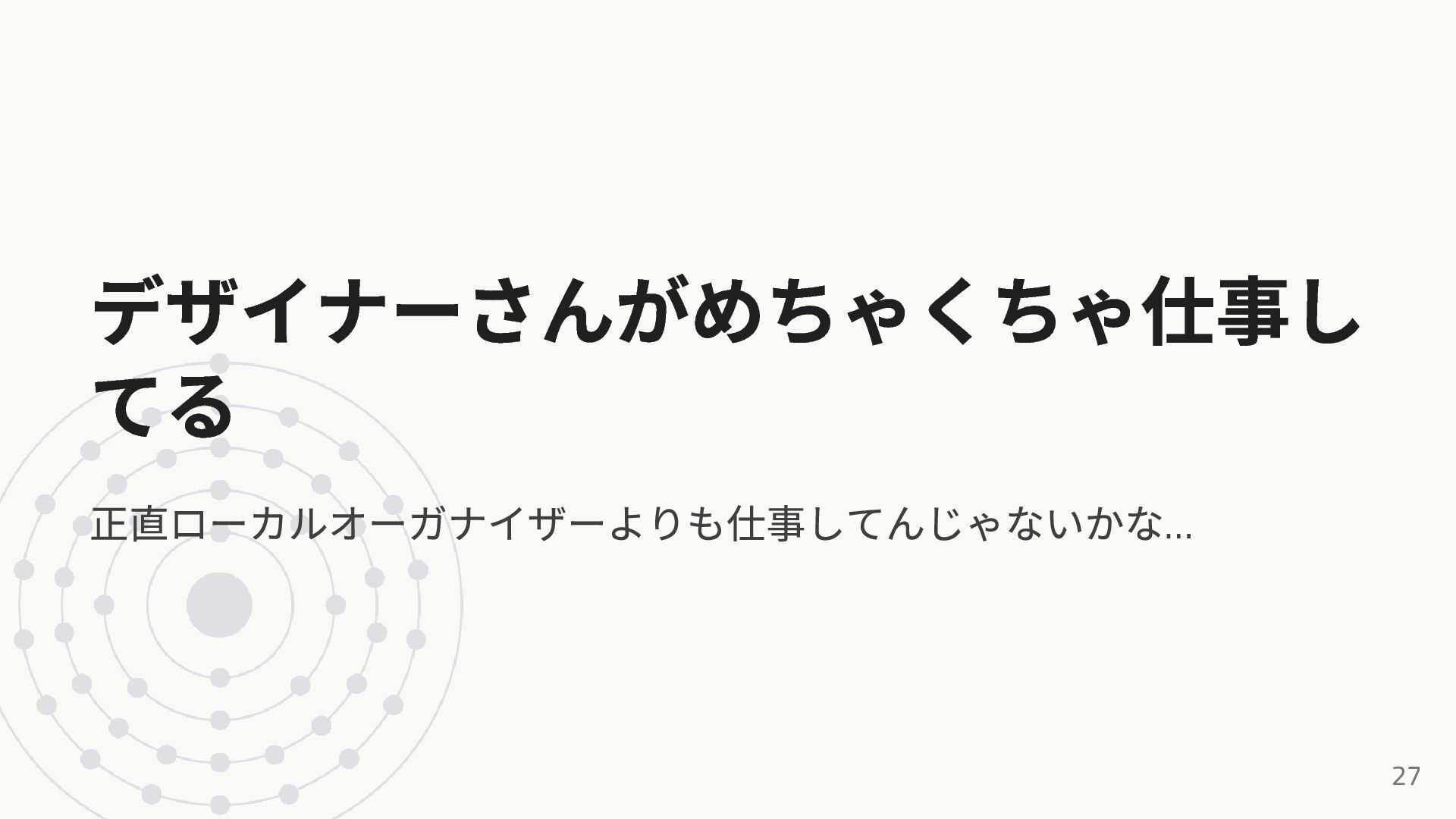 デザイナーさんがめちゃくちゃ仕事し てる 正直ローカルオーガナイザーよりも仕事してんじゃないかな… 27
