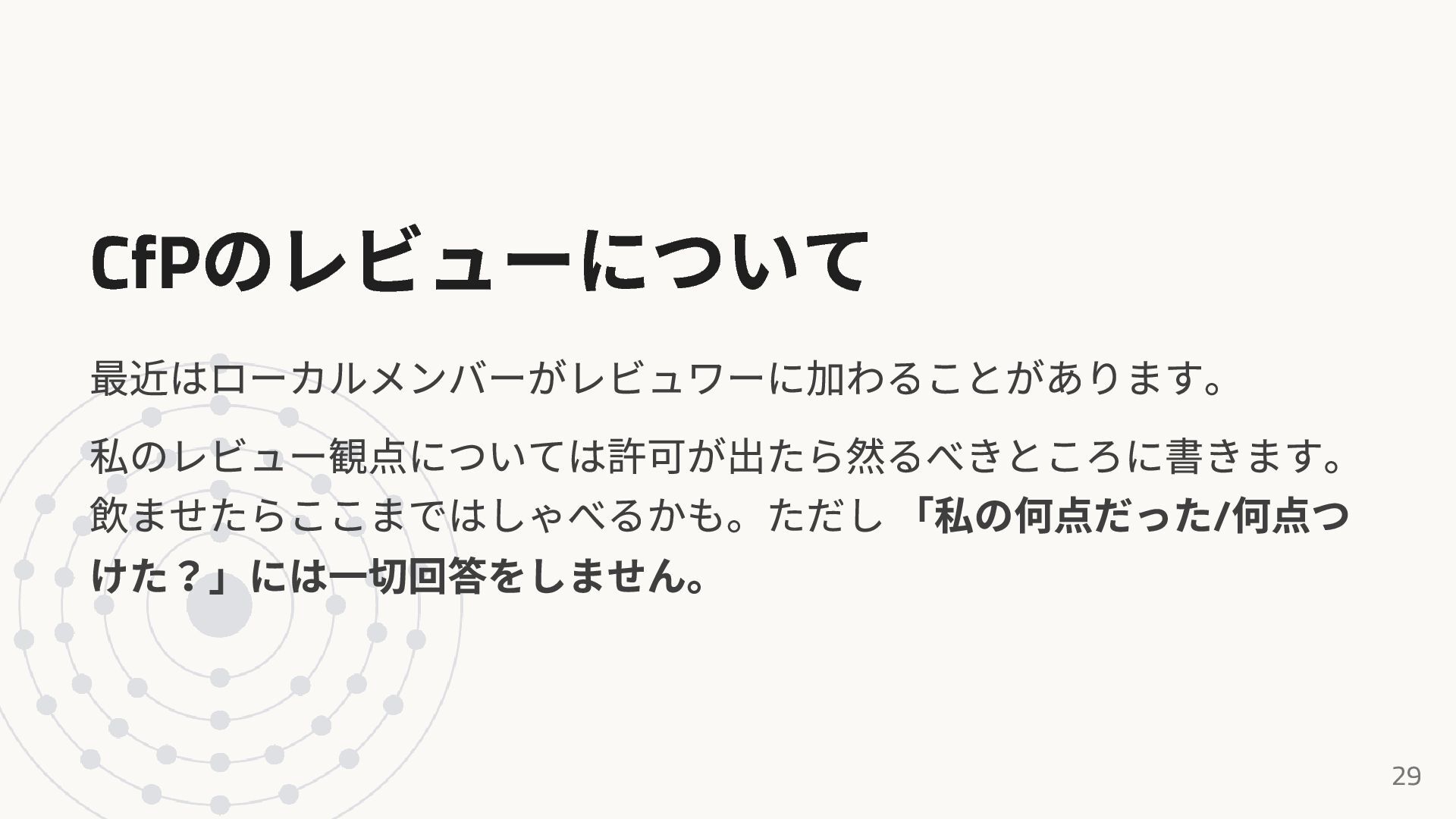 CfPのレビューについて 最近はローカルメンバーがレビュワーに加わることがあります。 私のレビュー観点については許可が出たら然るべきところに書きます。 飲ませたらここまではしゃべるかも。ただし 「私の何点だった/何点つ けた?」には一切回答をしません。 29