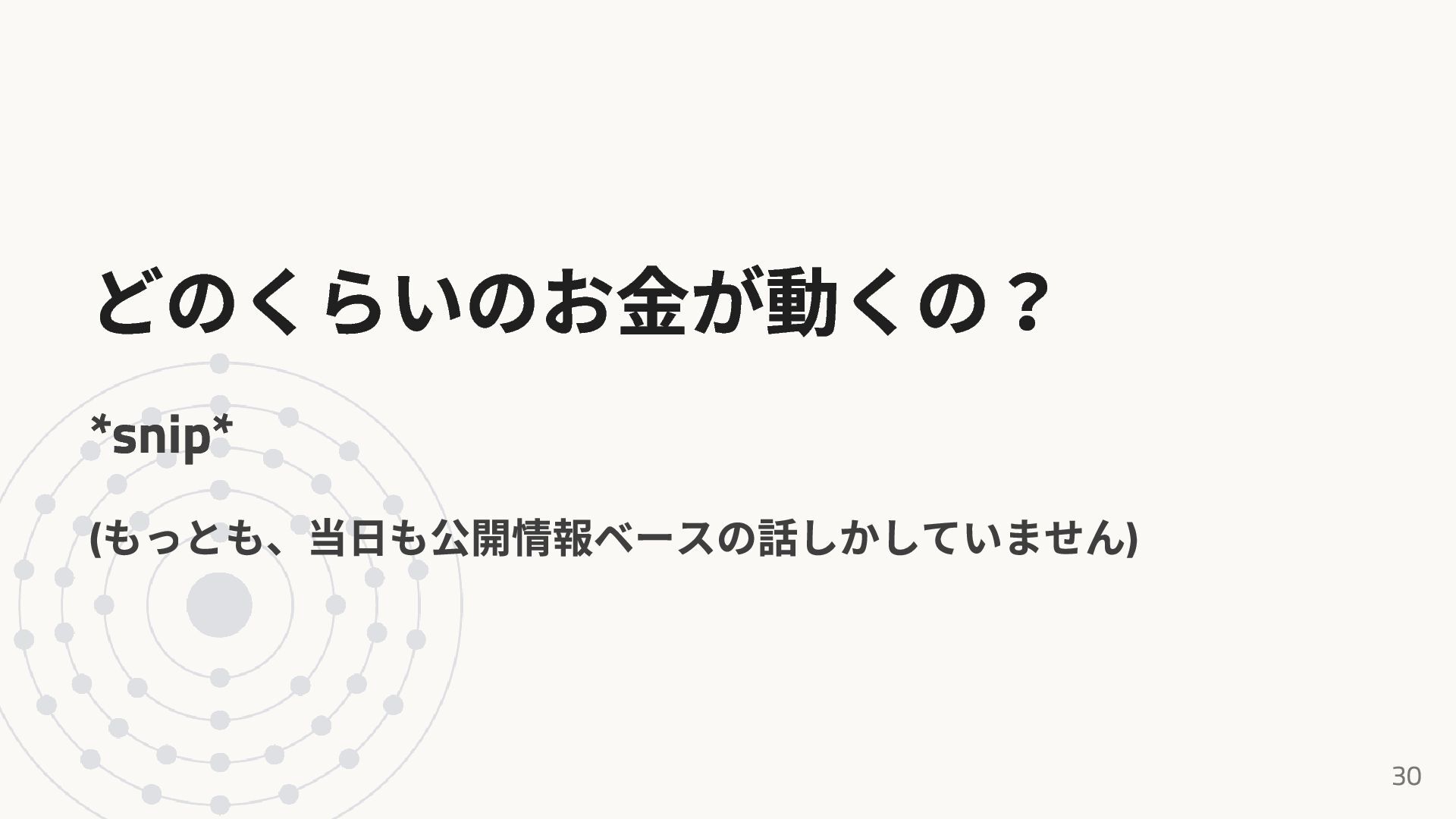 どのくらいのお金が動くの? *snip* (もっとも、当日も公開情報ベースの話しかしていません) 30